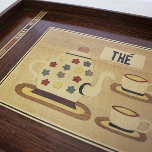 マルケトリは嵌め込み細工、又は象嵌細工のことで、薄い木の板から図柄を切り取って張り合わせて作ります。職人さんの手仕事によるトレーは実に素朴。ティータイムにぴったりの柄。