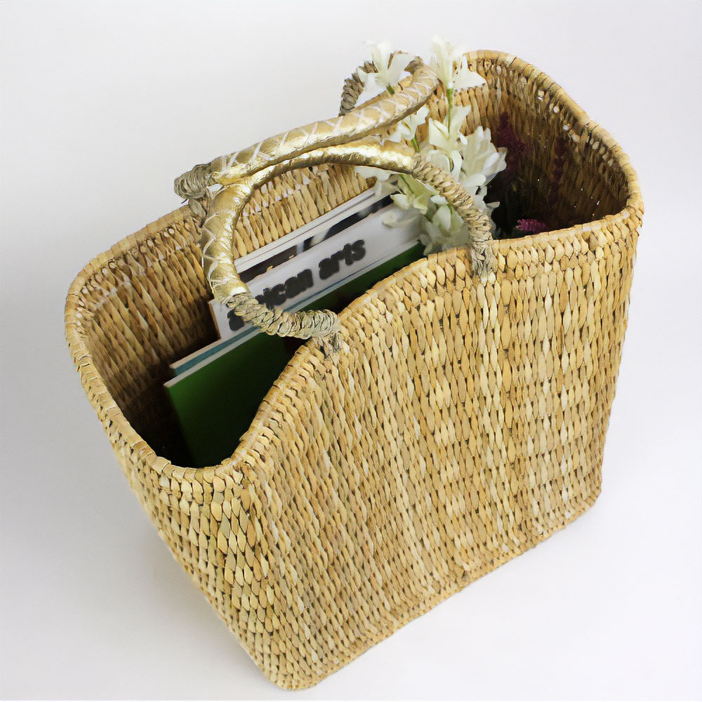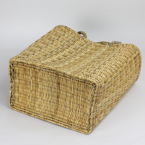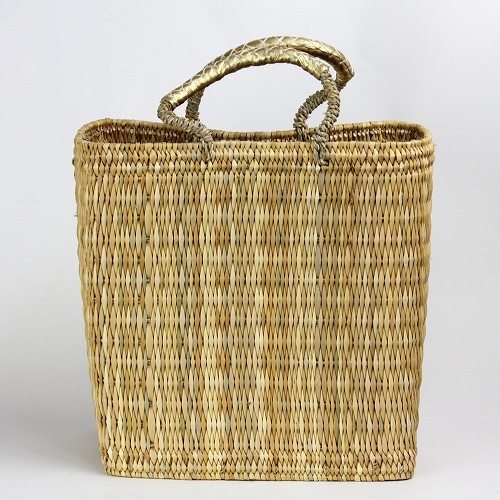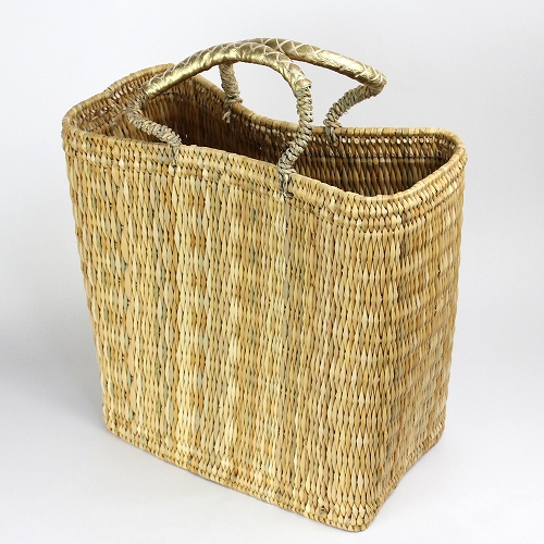 ストロー状の水草で編んだ、長方形タイプのかごバッグです。ハンドルのゴールドクロスステッチがおしゃれです。モロッコでJONK(ジョンク)と呼ばれる表面がツルツルした丈夫な素材。素朴な風合とたたみのような編み目が人気です。ナチュラルテイストでどんなお洋服にも合います。お出かけに、ワインやお弁当をいれてランチバッグとしても活躍します。自立するので、雑誌やスリッパなどインテリアバスケットとしてもご使用いただけます。LMSございます。