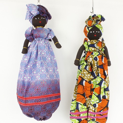 スカート部分にレジ袋を収納できる愉快なアフリカンドールです。すそ部分にゴムがついていて、出し入れも楽な優れもの。西アフリカのパーニュ布を贅沢に使用したアフリカンなお人形です。