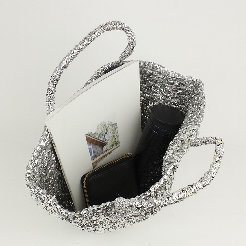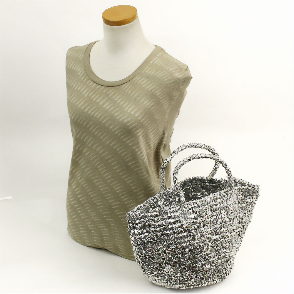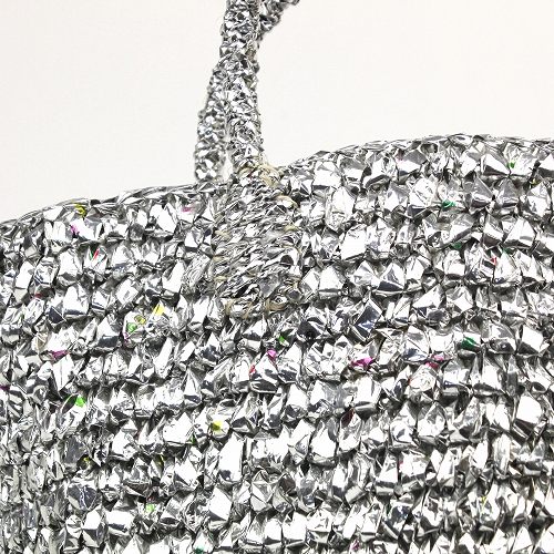 シルバーリボンをかぎ編みした、エコでライトなカゴバッグ。ハンドルのみサイザル麻と編みこんでいます。銀色部分は、お菓子(クッキーなど)の包装紙に使われている端紙をリサイクルしました。コロンとしたフォルムの使いやすいカゴバッグです。リサイクルのため、使用部分によって印象が変わる場合がございます。予めご了承ください。