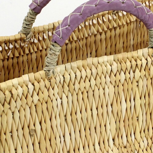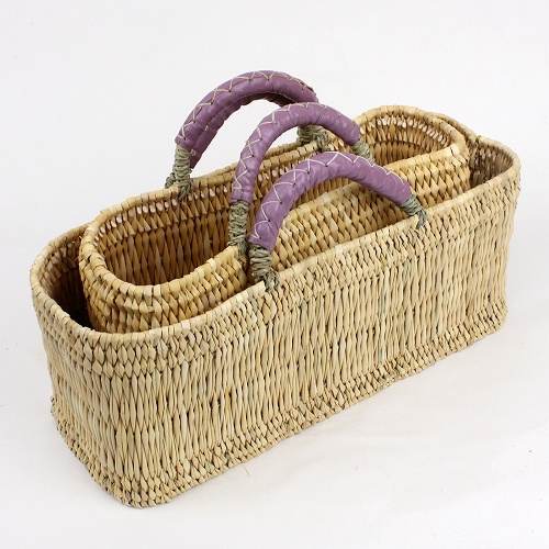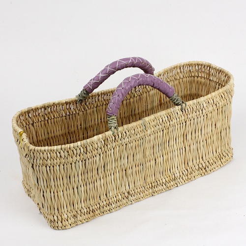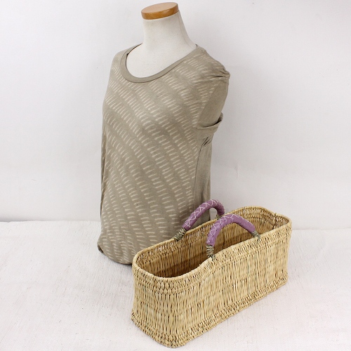 ストロー横長カゴ 中 革ハンドル ラベンダー