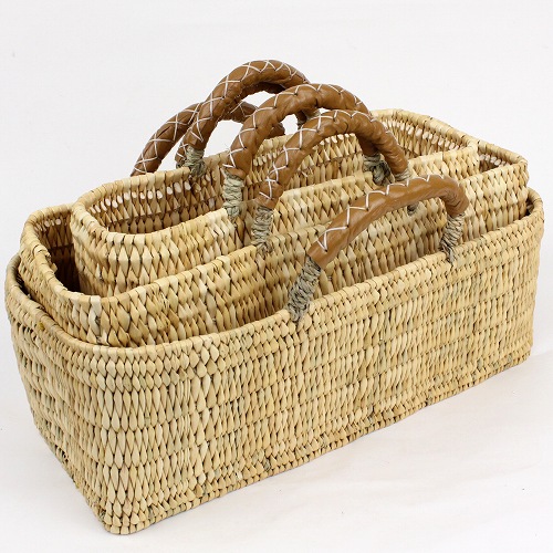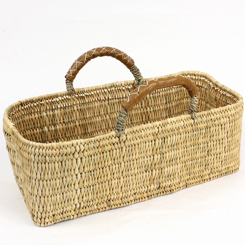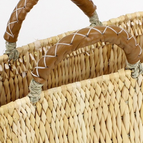 ストロー状の水草で編んだ、横長タイプのかごバッグです。モロッコでJONK(ジョンク)と呼ばれる表面がツルツルした丈夫な素材で、ナチュラルな風合とたたみのような編み目が人気です。ハンドルのクロスステッチがポイント。どんなお洋服にもコーディネイトしやすく、お出かけやお買い物に、ワインやお弁当をいれてランチバッグとしても活躍します。自立するので、雑誌やスリッパなどインテリアバスケットとしてもご使用いただけます。各サイズございます。