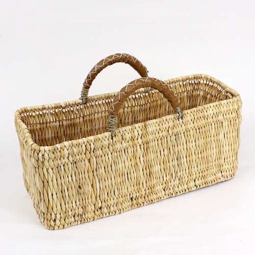 クロスステッチを施した革のハンドルがポイントの、横長タイプストローバッグです。ストローとは現地でジョンクと呼ばれている水草の一種。表面がツルツルして持ちやすく、シンプルなデザインで合わせやすいカゴバッグです。またCDや小物を入れてインテリアバスケットとしてもお使いいただけます。
