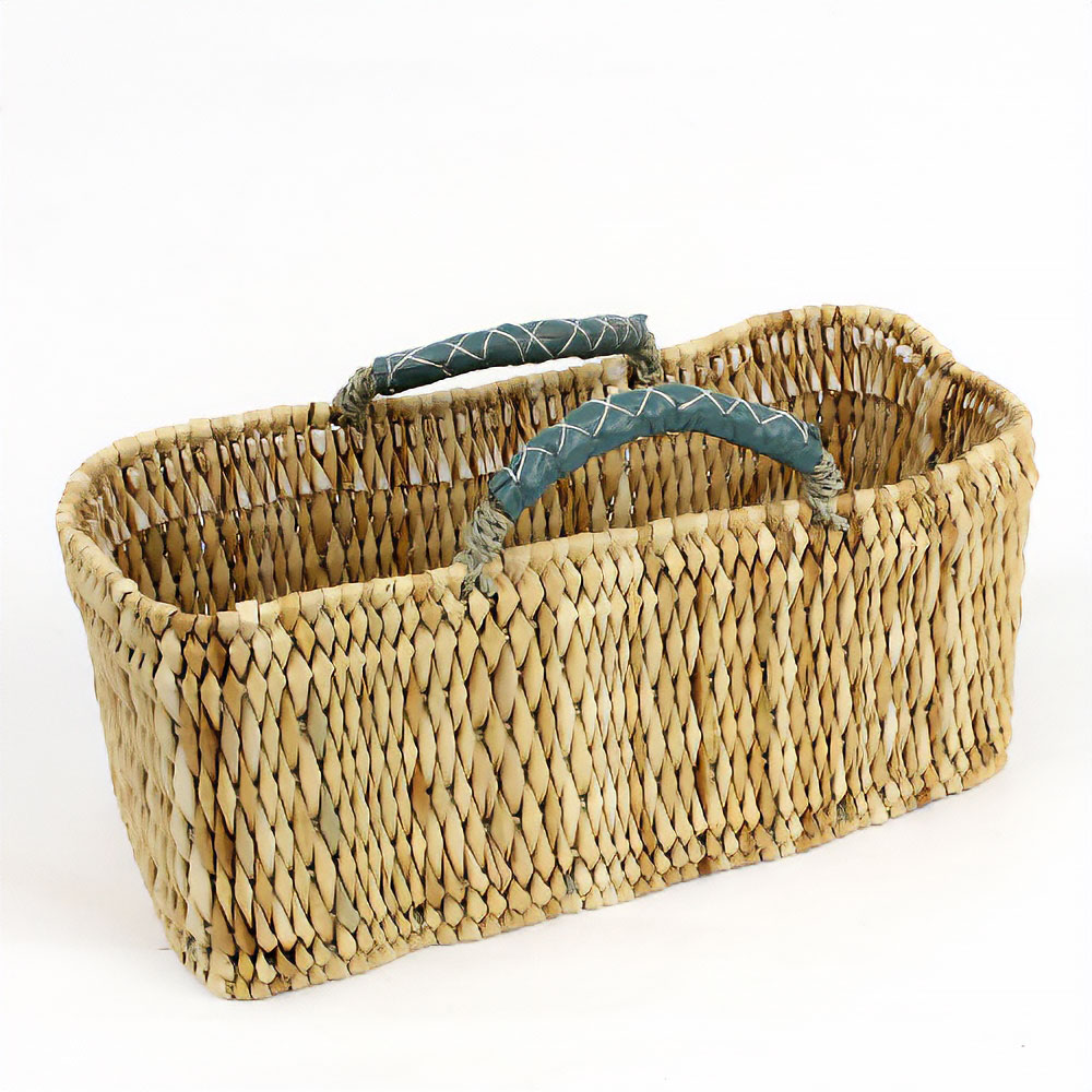 ストロー横長カゴ 中 革ハンドル マラカイト