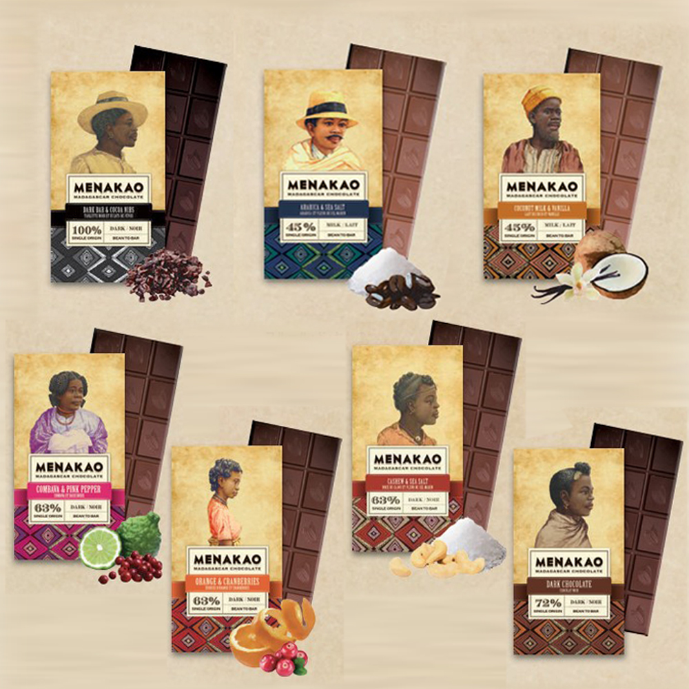 「メナカオ」とは、マダガスカル語で「赤」という意味の「MENA」とカカオの意味の「KAO」。原材料のカカオは、サンビラーノ川の恩恵を受けた肥沃な大地で育ち、農薬や肥料をを使わずに育てられた質の良いカカオです。小さな農園でごく自然に近い形で大切に栽培されています。マダガスカルカカオは、品質が良いことで知られており、その品質はICCO(The International Cocoa OrganiZation)により保証されています。マダガスカルカカオの特徴を生かすべく、独自のレシピでこだわりの製造をしています。インパクトのあるパッケージには、それぞれの地域、民族の伝統衣装をまとったマダガスカルの人々を描かれ、先祖への思いがこめられています。また、フェアトレードの概念のもと、カカオはフェアトレード最高価格で取引しています。マダガスカルの自社工場で製造することにより、雇用の創出にもつながっています。