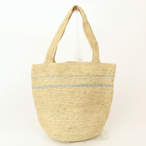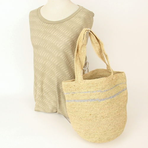 マダガスカル産ラフィア製オリジナルトートバッグです。美しい細編みにシルバーリボンのストライプがポイント。肩掛けもできます。シンプルな中に洗練されたテイスト、丸底なのでいっぱい入る機能的なトートです。素材は、しなやかで軽いマダガスカル産ラフィアを使用しています。熟練の編み子さんが、丁寧に編み上げているので、仕上がりが美しく、永くお使いいただけます。