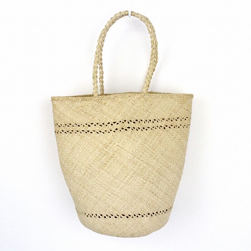 マダガスカルはラフィア原産の地、インド洋の果てに浮かぶ「原始人の置き忘れた左足」と呼ばれる島国です。島の女性たちが、楽しくおしゃべりしながら、熟練した技ですばやく編み上げていきます。村の女性たちはバッグ編みで生活を補っており、需要な現金収入源となっています。