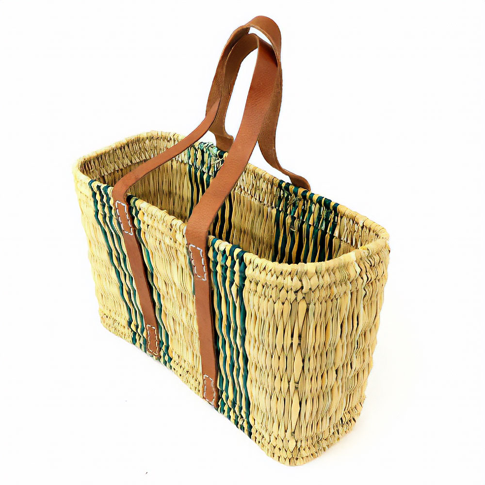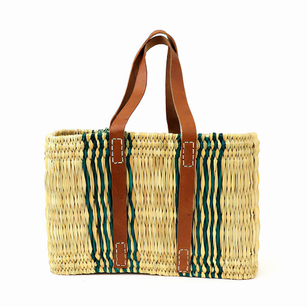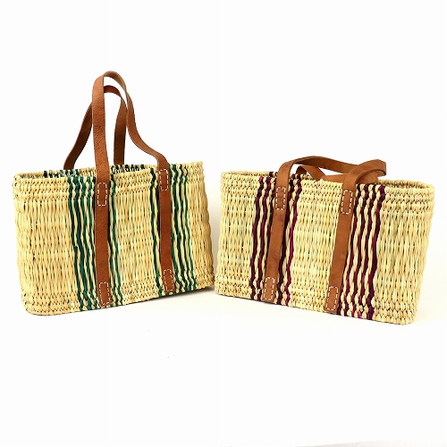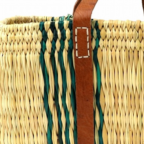 ストロータイプの水草を編んだ柄入りカゴバッグです。ぐるり平革ハンドルがポイント。モロッコでJONK(ジョンク)と呼ばれる表面がツルツルした丈夫な素材で、ナチュラルな風合とたたみのような編み目が人気です。どんなお洋服にもコーディネイトしやすく、お出かけやお買い物に、ワインやお弁当をいれてランチバッグとしても活躍します。自立するので、雑誌やスリッパなどインテリアバスケットとしてもご使用いただけます。色落ち色移りに注意