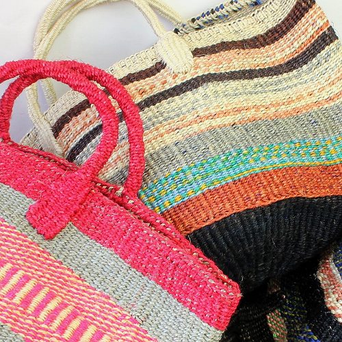 サイザルとはリュウゼツランの一種で、その繊維は歴史的に広く使われていた繊維である麻にちなんでサイザル麻と呼ばれています。ケニアのキクユ人やカンバ人の伝統技術により サイザルで編んだバスケット(=キオンド)は穀物の運搬や保存にケニアでは使われていました。かごを編む技術は母から娘へと受け継がれ、ケニアの小さな農村の女性を中心にひとつひとつ手作りで編み上げています。現在ではサイザルバッグを編むことがケニアの村の重要な現金収入源となり、各家庭の子どもたちの学費となり生活費の足しとなっています。