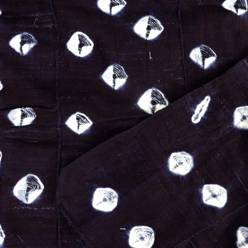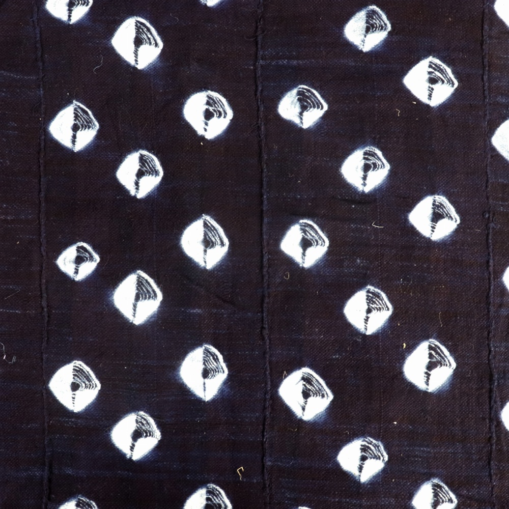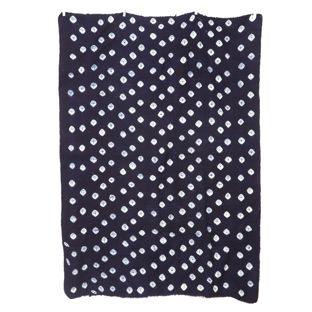 西アフリカでは古くから藍染が盛んで、代々親から子へ藍染文化が伝承されてきました。これらはヨルバインディゴと呼ばれるマメ科の藍植物で染められ、抗菌効果、防虫、防カビ、防臭効果など優れた作用があるといわれています。 独特な絞り染めの図案は、ラフィアの糸などを使い布を絞り、藍染液につけ模様を出します。多くの時間を費やし染められたアフリカの藍染です。