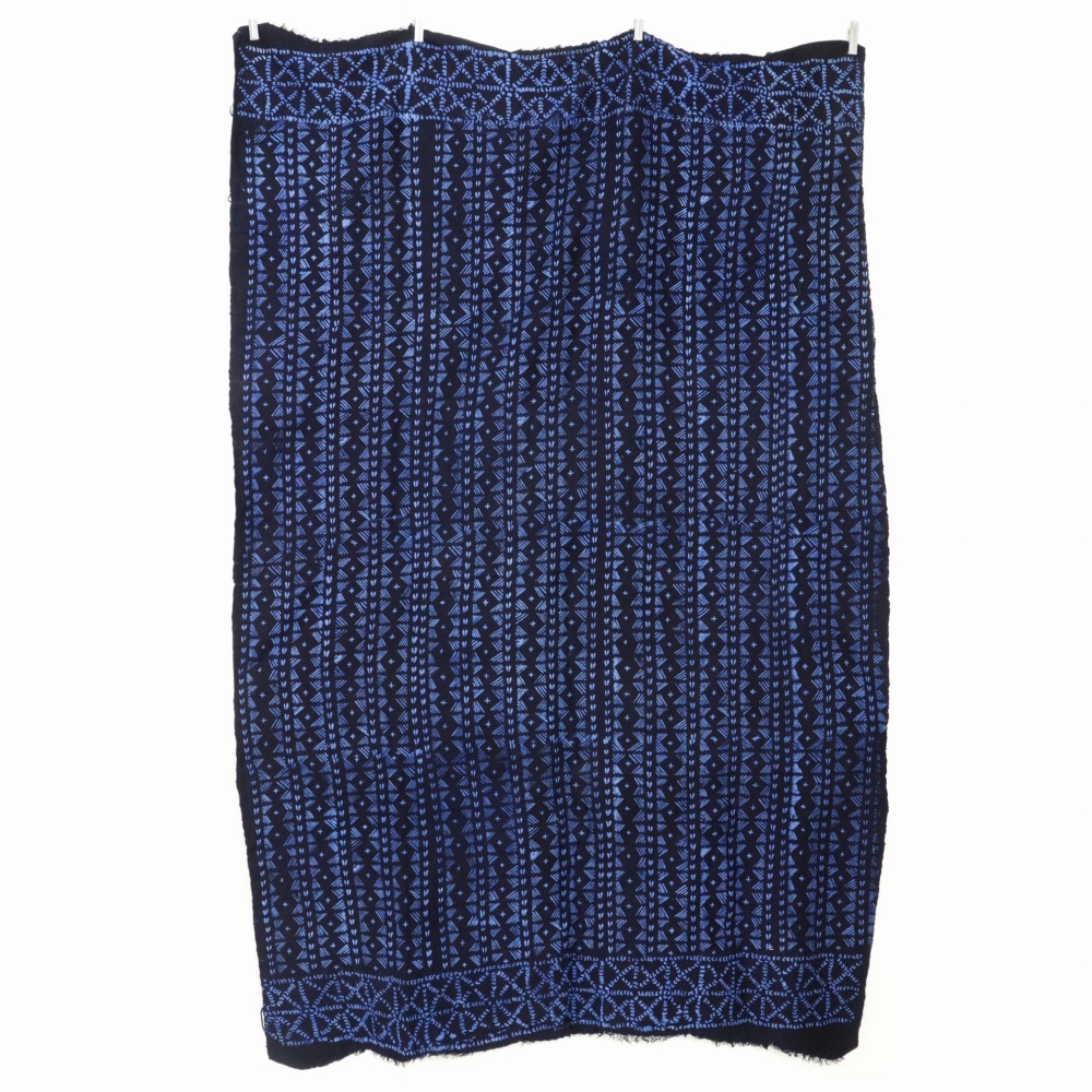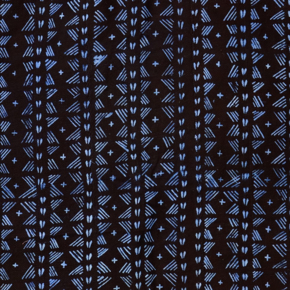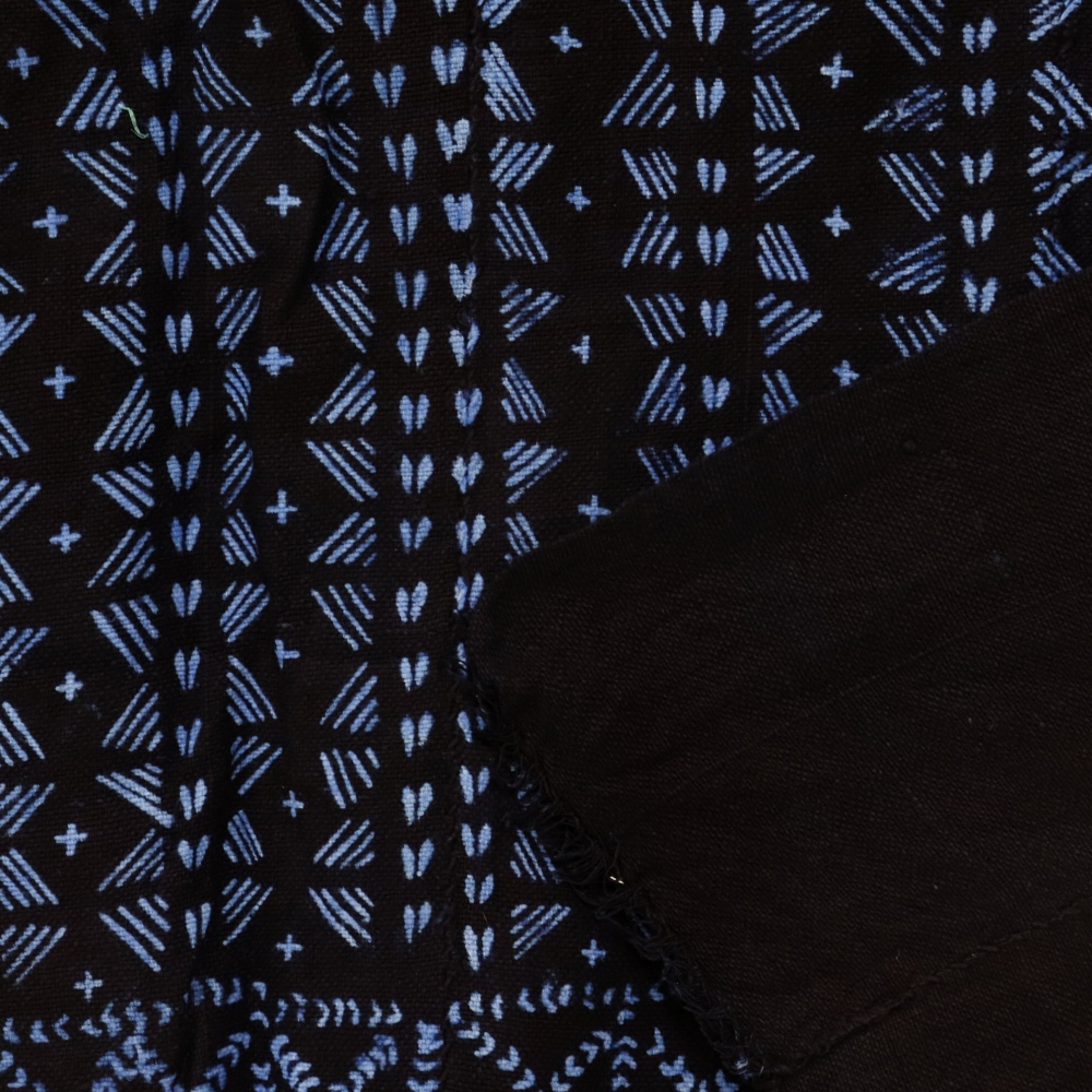 西アフリカでは古くから藍染が盛んで、代々親から子へ藍染文化が伝承されてきました。これらはヨルバインディゴと呼ばれるマメ科の藍植物で染められ、抗菌効果、防虫、防カビ、防臭効果など優れた作用があるといわれています。 独特な絞り染めの図案は、ラフィアの糸などを使い布を絞り、藍染液につけ模様を出します。多くの時間を費やし染められたアフリカの藍染です。