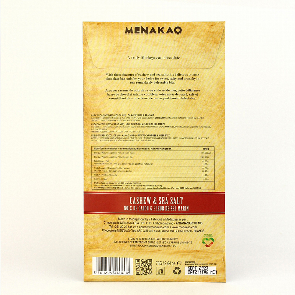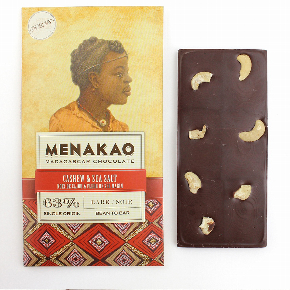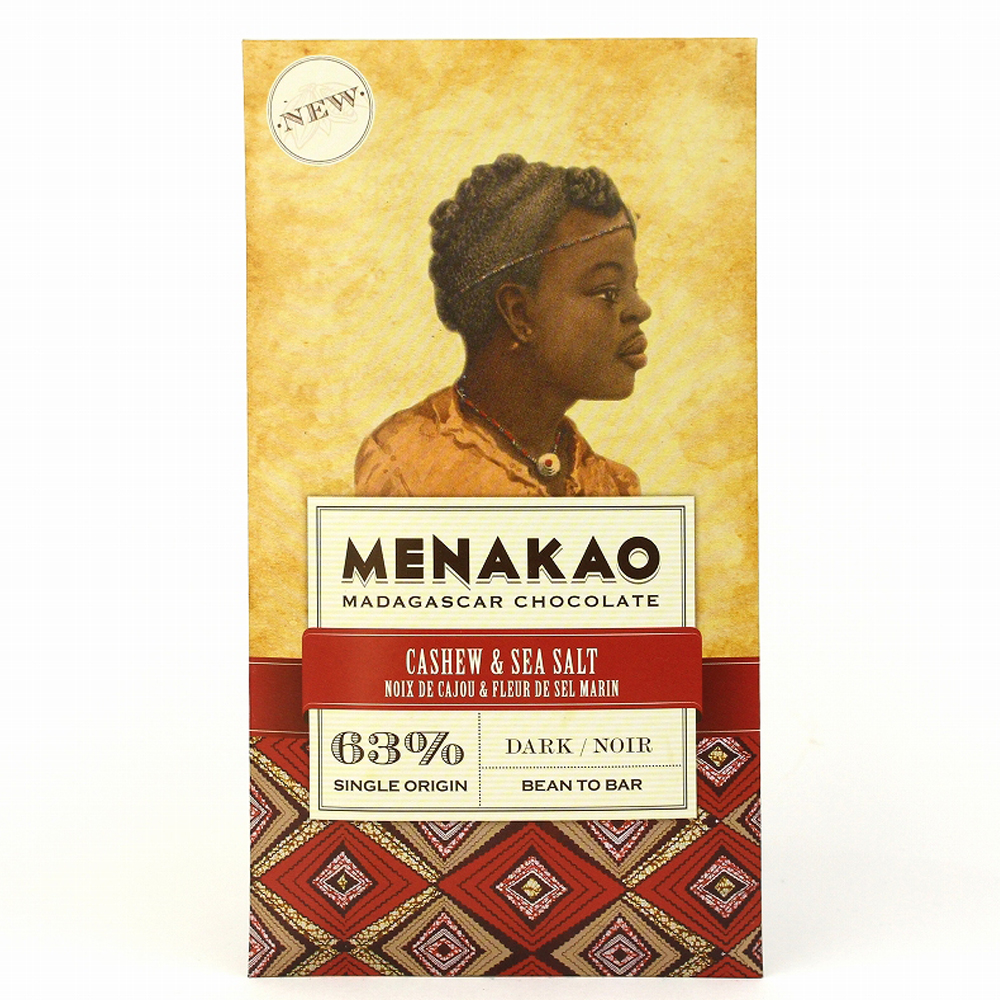 マダガスカルのビーントゥーバーなチョコレート「メナカオチョコレート」。マダガスカルカカオらしいフレッシュな酸味のカカオ63%ダークチョコレートバーの裏には、カシューナッツが。特産のフルールドセル(塩)が絶妙なダークチョコレートです。「メナカオ」とは、マダガスカル語で「赤」という意味の「MENA」とカカオの意味の「KAO」。原材料のカカオは、サンビラーノ川の恩恵を受けた肥沃な大地で育ち、農薬や肥料をを使わずに育てられた質の良いカカオです。小さな農園でごく自然に近い形で大切に栽培されています。マダガスカルカカオは、品質が良いことで知られており、その品質はICCO(The International Cocoa OrganiZation)により保証されています。マダガスカルカカオの特徴を生かすべく、独自のレシピでこだわりの製造をしています。インパクトのあるパッケージには、それぞれの地域、民族の伝統衣装をまとったマダガスカルの人々を描かれ、先祖への思いがこめられています。また、フェアトレードの概念のもと、カカオはフェアトレード最高価格で取引しています。マダガスカルの自社工場で製造することにより、雇用の創出にもつながっています。