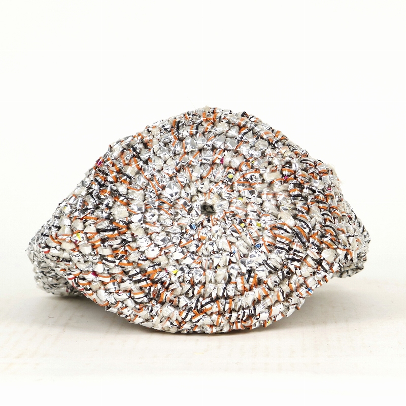 プラスチックテープを編みこんだネット状のかぎ編みバッグです。アップサイクル材を使用、キラキラポップなデザインがキュートです。銀色部分は、お菓子(クッキーなど)の包装紙に使われている端紙をリサイクルしました。