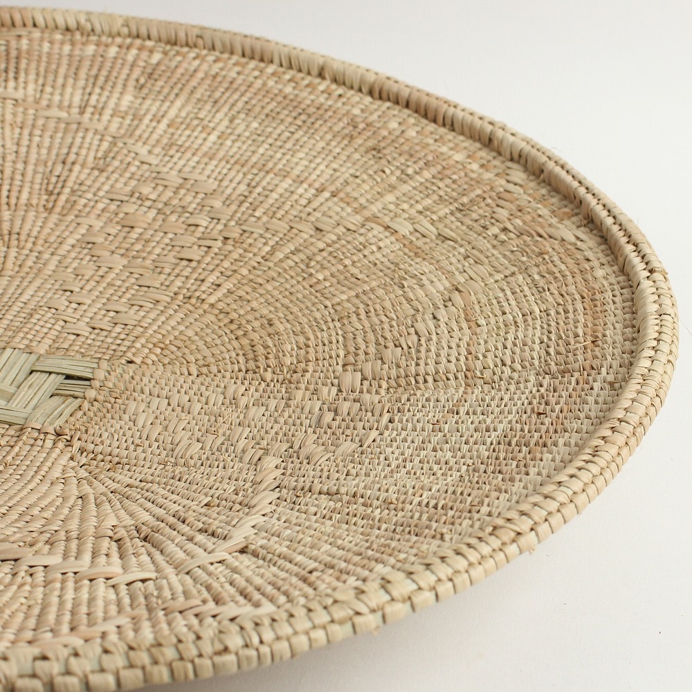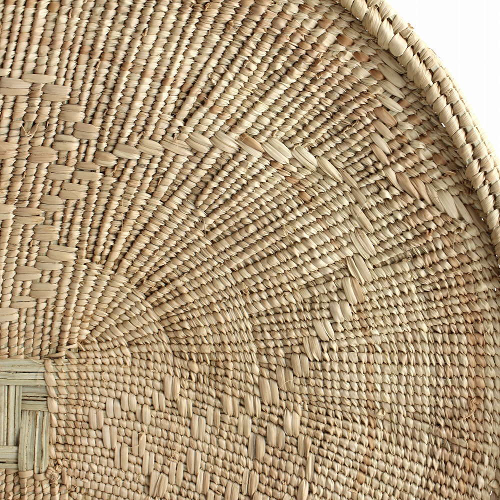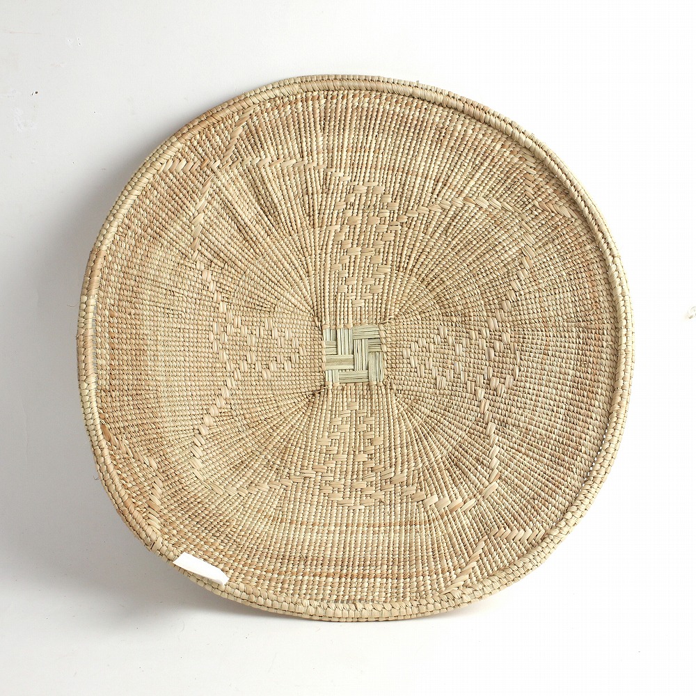 ジンバブエ西部ワンゲ(Hwange)地方で編まれているバスケット大き目サイズです。トンガサングエバスケットより白っぽい仕上がりで、細かい編みと縁の処理が特徴です。イララと呼ばれるパーム椰子を編み込み柄は実に多種多様、一つとして同じ柄が無いほどです。落ち着いた草木染のナチュラルカラーで、どんなインテリアにもマッチします。