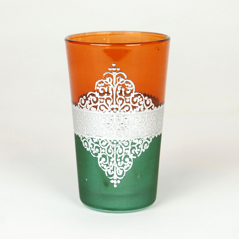 2トーンの鮮やかな色彩とシルバーカラーのプリントがゴージャスなモロッコプリントグラスです。表面にエキゾチックな模様をプリントしたグラスは、現地ではミントティーグラスとして日常的に使われています。食品検査済