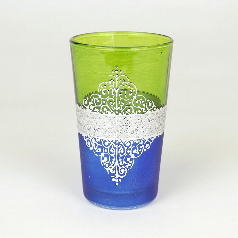 2トーンの鮮やかな色彩とシルバーカラーのプリントがゴージャスなモロッコプリントグラスです。表面にエキゾチックな模様をプリントしたグラスは、現地ではミントティーグラスとして日常的に使われています。食品検査済
