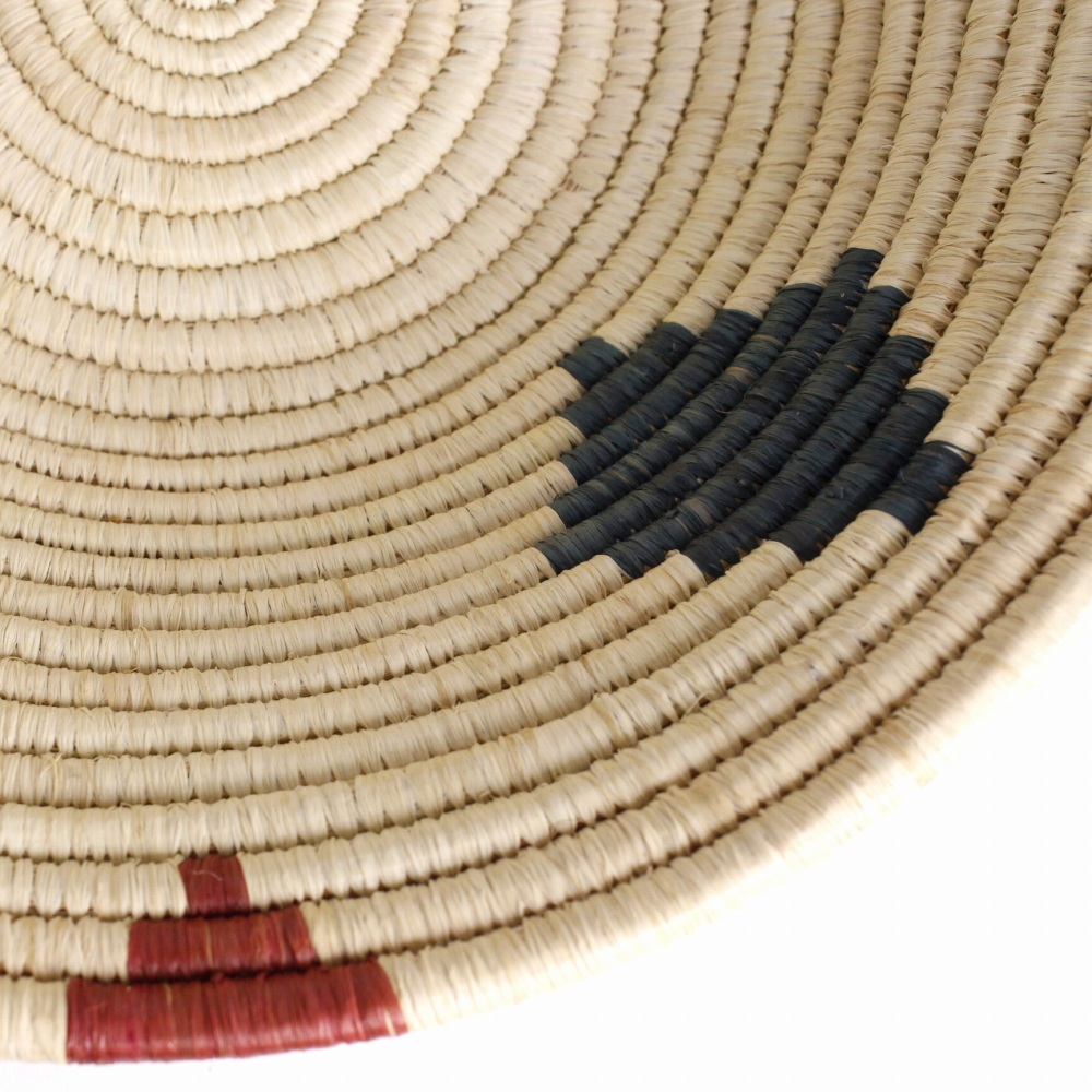 ウガンダ、トーロ地方の、水草に椰子の葉を巻き付けて編み上げた、ダイヤ柄入りのナチュラルな平カゴです。フルーツや小物入れに。壁に掛けてウォールデコバスケットとしてインテリアにもなります。