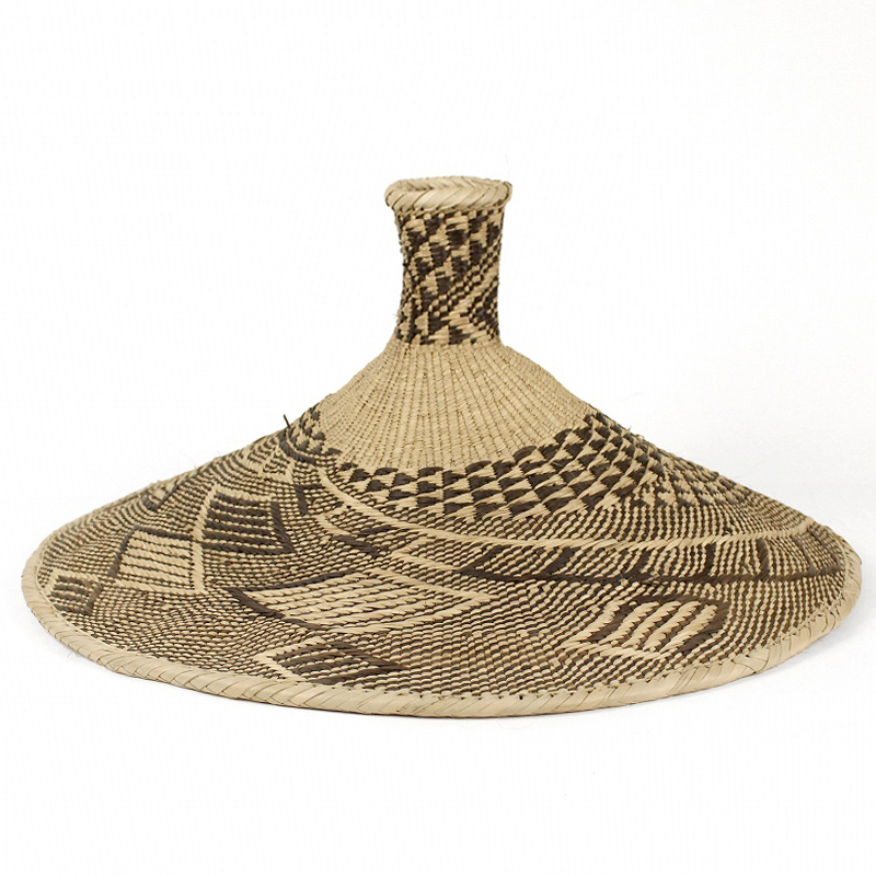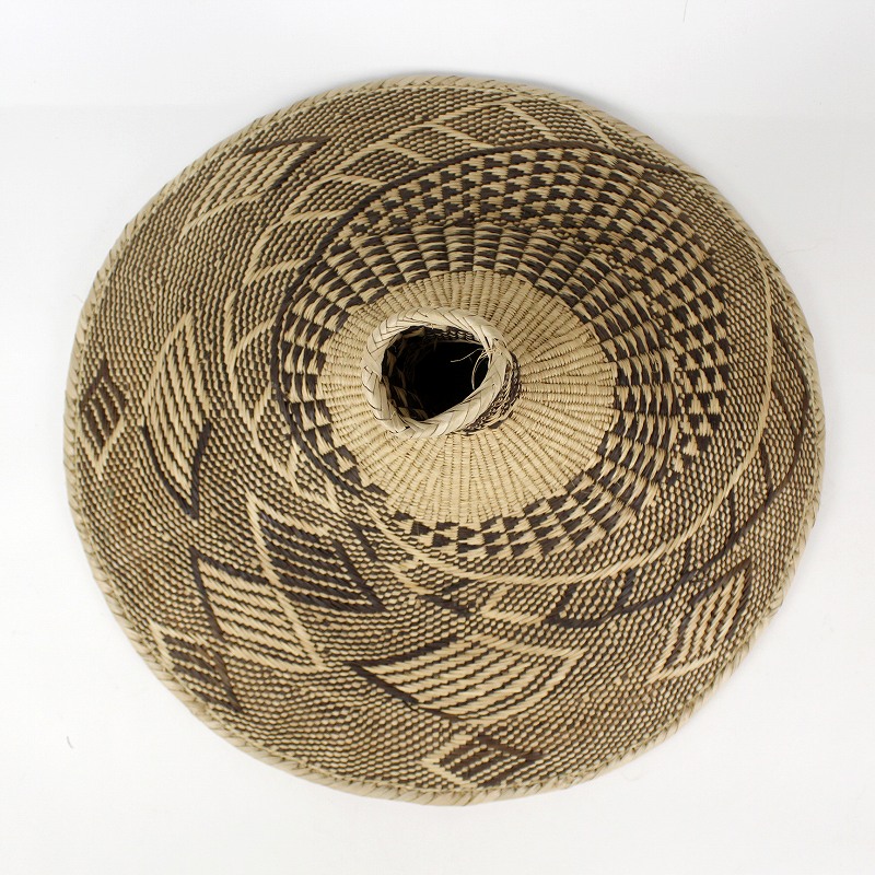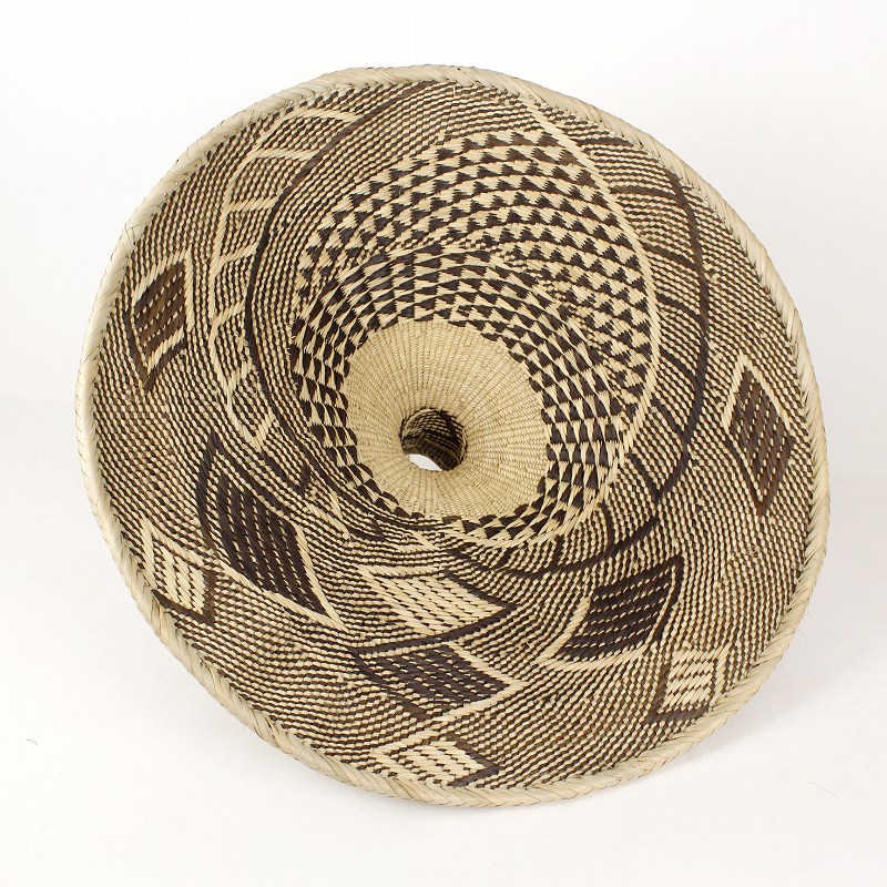 イララという椰子の一種の葉を手編みして作る芸術性の高いインテリアかご「トンガバスケット」。こちらはかご同様、トンガの人々が編み上げたランプシェードです。草木染の自然な色合いが織りなす豊かな美しい表情が魅力。ジンバブエのトンガ人の女性が一つ一つ編み上げる柄は実に多種多様、一つとして同じ柄が無いほどです。*ソケットは別料金です。