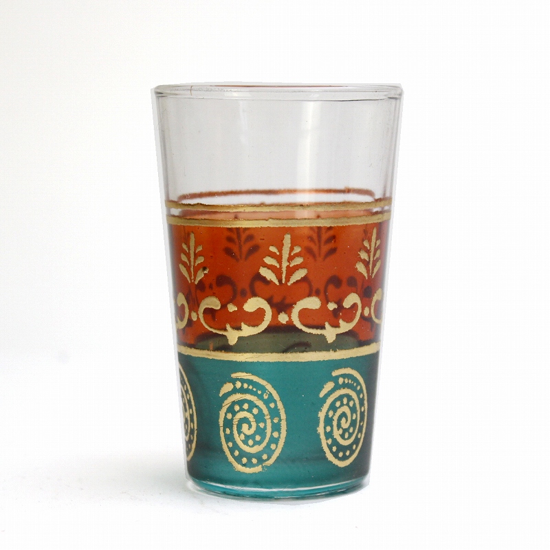 カラフルな絵柄と金色のプリントがゴージャスなモロッコグラスです。表面にエキゾチックな模様をプリントしたグラスは、現地ではミントティーグラスとして日常的に使われています。食品検査済