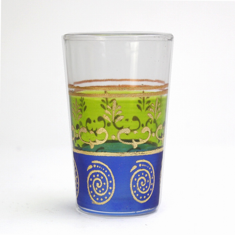 カラフルな絵柄と金色のプリントがゴージャスなモロッコグラスです。表面にエキゾチックな模様をプリントしたグラスは、現地ではミントティーグラスとして日常的に使われています。食品検査済
