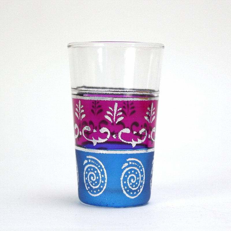 カラフルな絵柄と金色のプリントがゴージャスなモロッコプリントグラスです。表面にエキゾチックな模様をプリントしたグラスは、現地ではミントティーグラスとして日常的に使われています。食品検査済