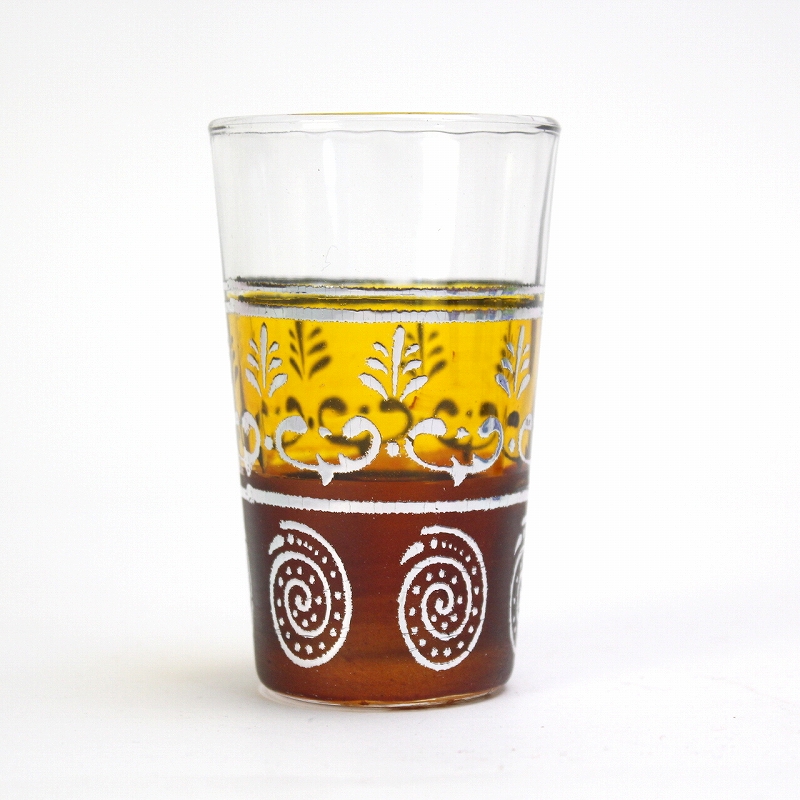 カラフルな絵柄と金色のプリントがゴージャスなモロッコプリントグラスです。表面にエキゾチックな模様をプリントしたグラスは、現地ではミントティーグラスとして日常的に使われています。食品検査済