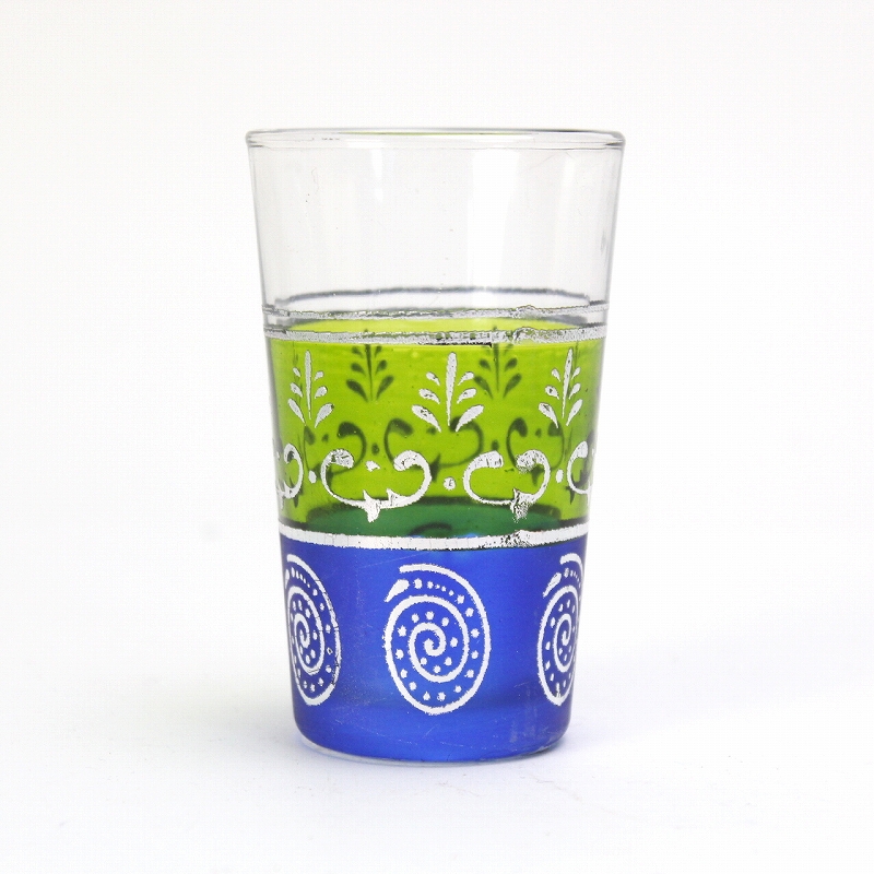 カラフルな絵柄と金色のプリントがゴージャスなモロッコプリントグラスです。表面にエキゾチックな模様をプリントしたグラスは、現地ではミントティーグラスとして日常的に使われています。食品検査済