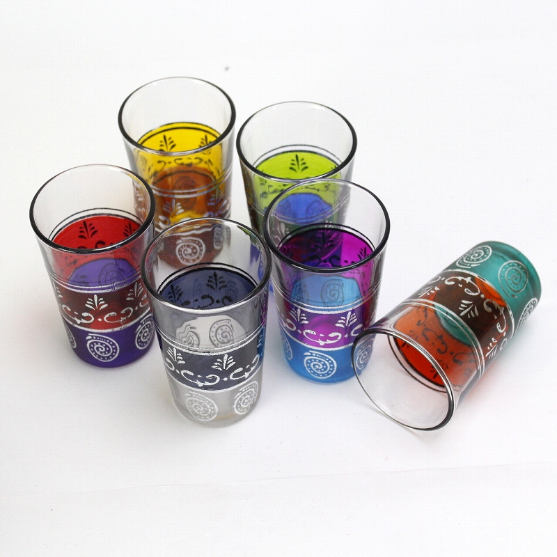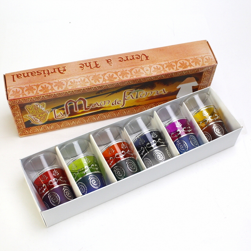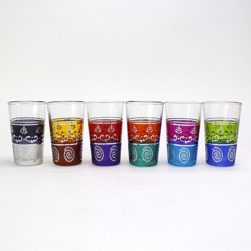 カラフルな絵柄と金色のプリントがゴージャスなモロッコプリントグラスです。表面にエキゾチックな模様をプリントしたグラスは、現地ではミントティーグラスとして日常的に使われています。食品検査済