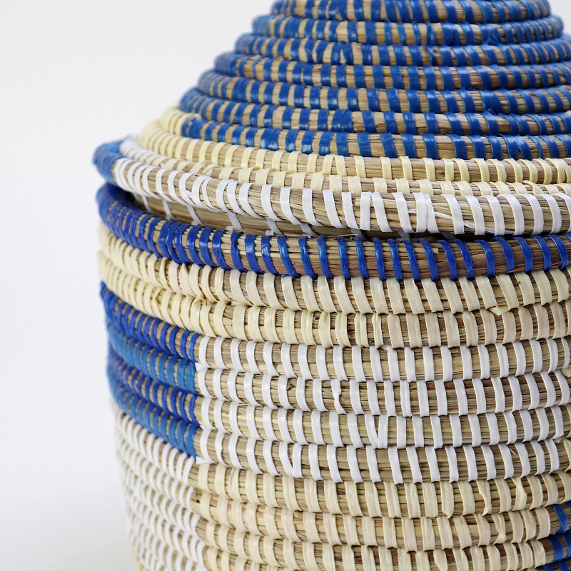 ガマ(水草)にビニールをコイル状に巻きしっかり編んだカラフルなインテリアカゴ。伝統的な技法にモダンなデザインが組み合わさりセネガルならではのポップな色合いと個性的なフォルムが人気です。とんがり蓋なのでインテリアのアクセントとしてお洒落なお部屋を演出できます。