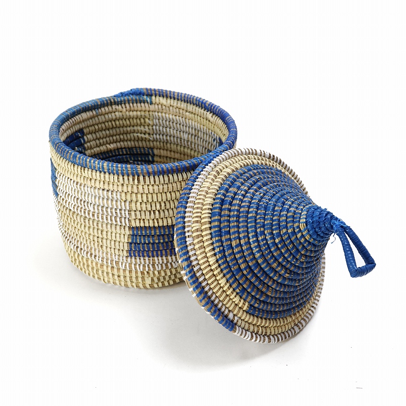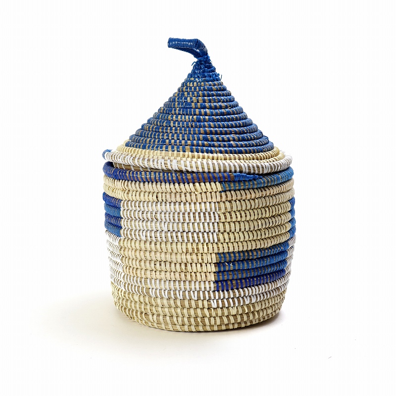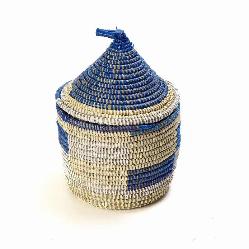 セネガルカゴ とんがり蓋付き 格子柄 小 白ベージュ紺