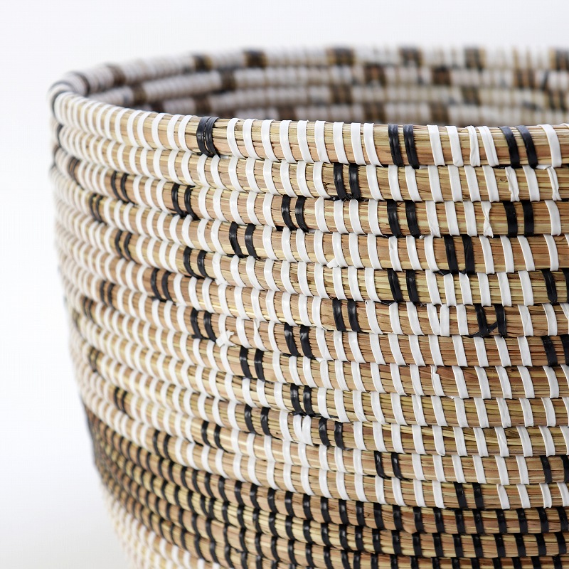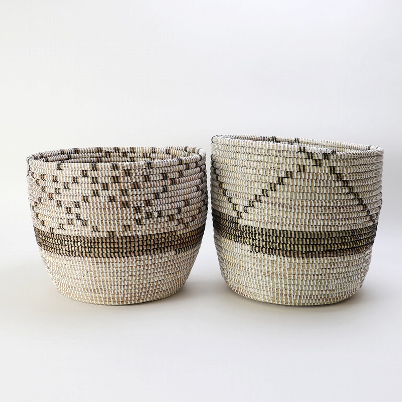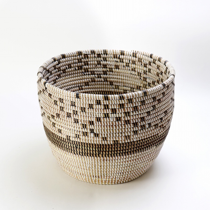 ガマ(水草)にビニールをコイル状に巻きしっかり編んだスタイリッシュなインテリアカゴです。人気のモノトーン柄。伝統的な技法にモダンなデザインが組み合わさりセネガルならではのポップな色合いと個性的なフォルムが人気です。