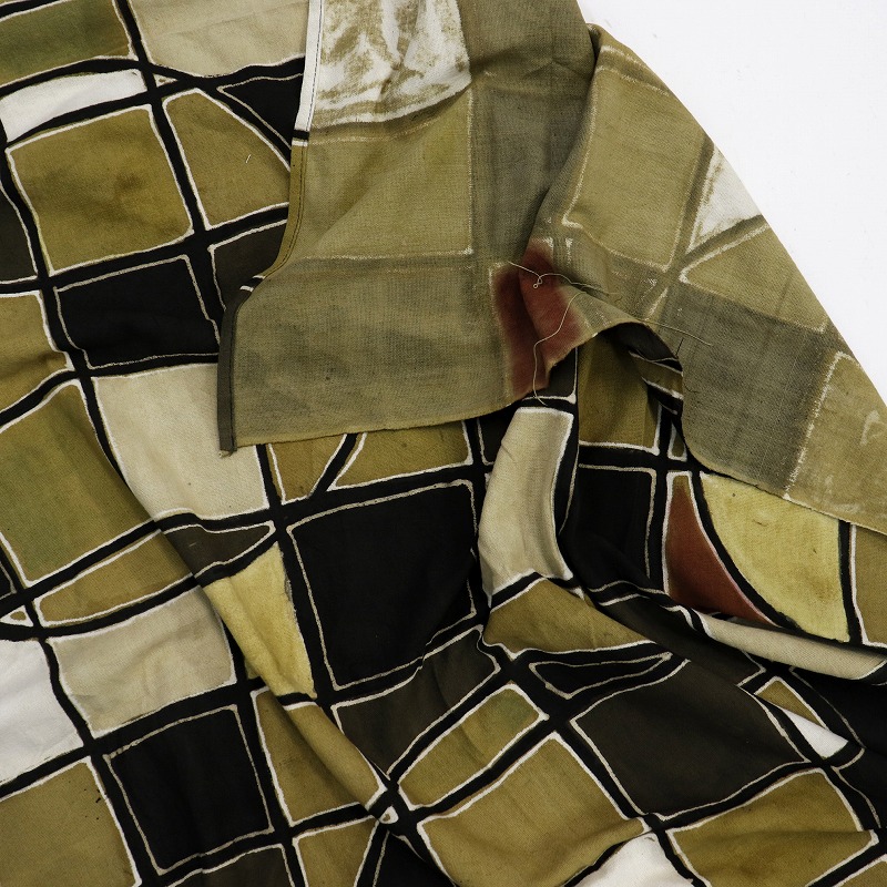 幅の細い布をつなぎ合わせて一枚布にする伝統的な生地ではなく、やや薄めの生地がベースになっています。布のゆがみやほつれ、サイズが若干異なる場合がございます。天然染料を使用しているため、多少の汚れがある場合がございます。この商品は摩擦、汗や雨などによる水濡れによって色落ち、色移りの恐れがあります。白色や淡色のものと組み合わせる際は、製品のお取り扱いに十分にご注意ください。洗濯の際にはドライクリーニングか単独での水洗いをおすすめします。以上のことを予めご了承のうえお買い求めください。