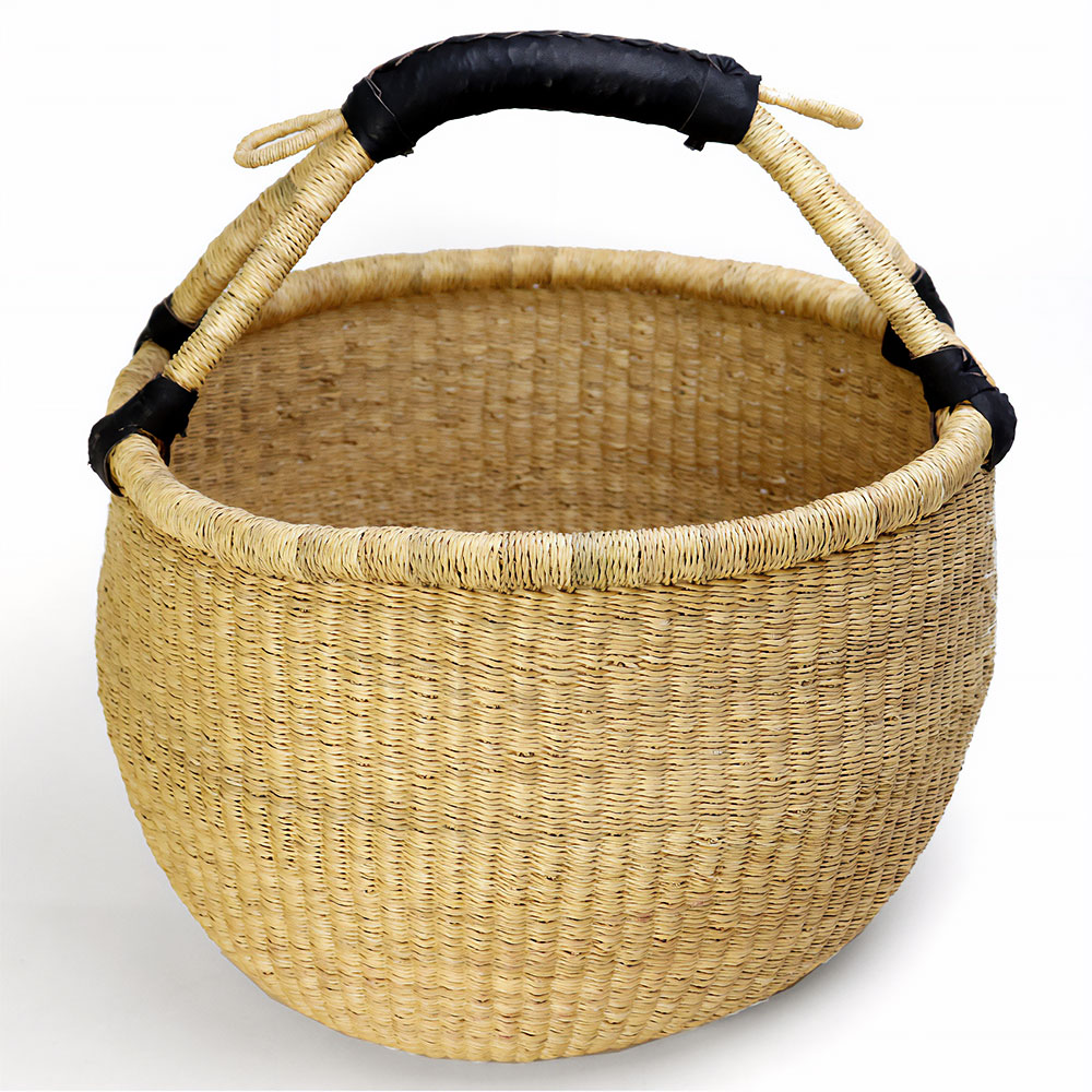 ブルキナファソ国境近くガーナのボルガ地方特産の一本ハンドルに黒革を巻きつけた、独特なフォルムのシックな丸いかごです。ランドリーバスケットやランチバスケットとしても、クロスなどを収納しても。おもちゃ入れにもぴったりです。コロンと置いたり、フックに吊り下げたり、お部屋を楽しく演出します。