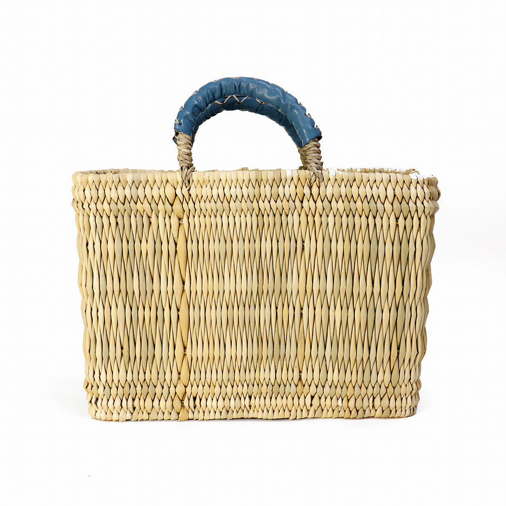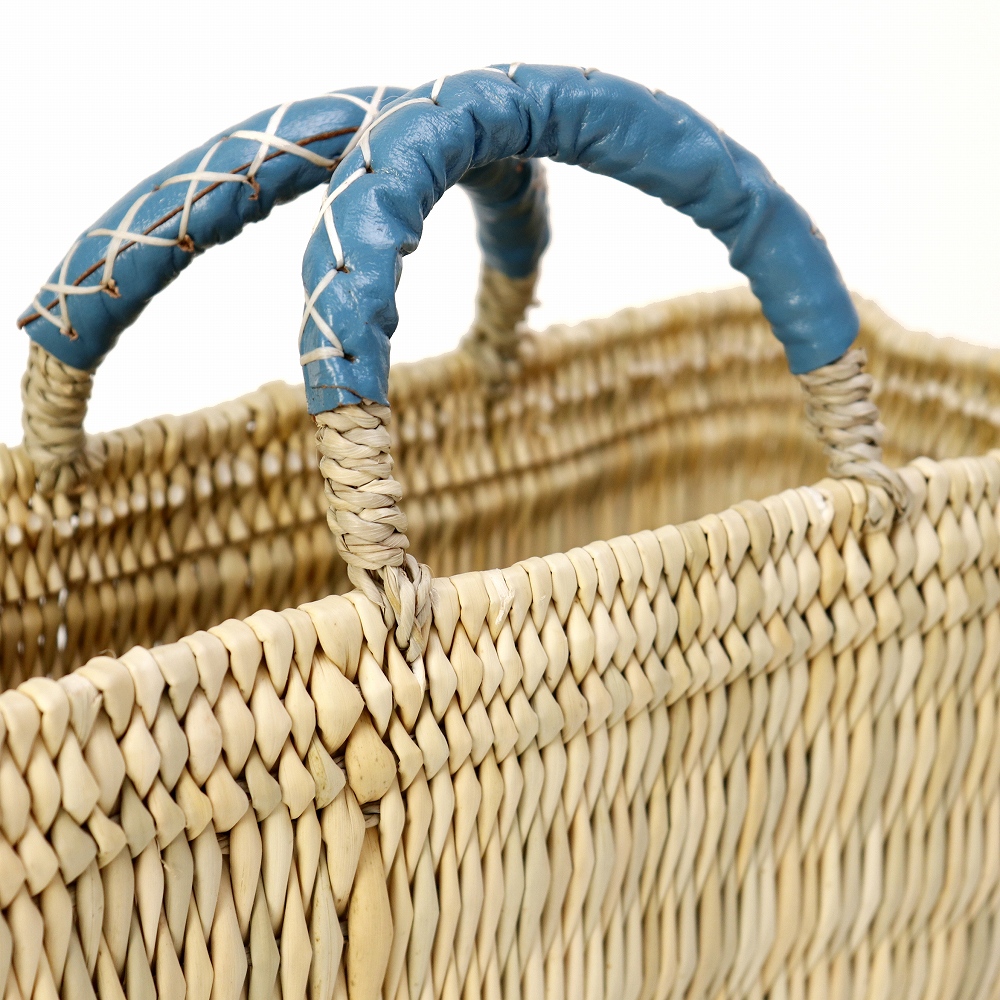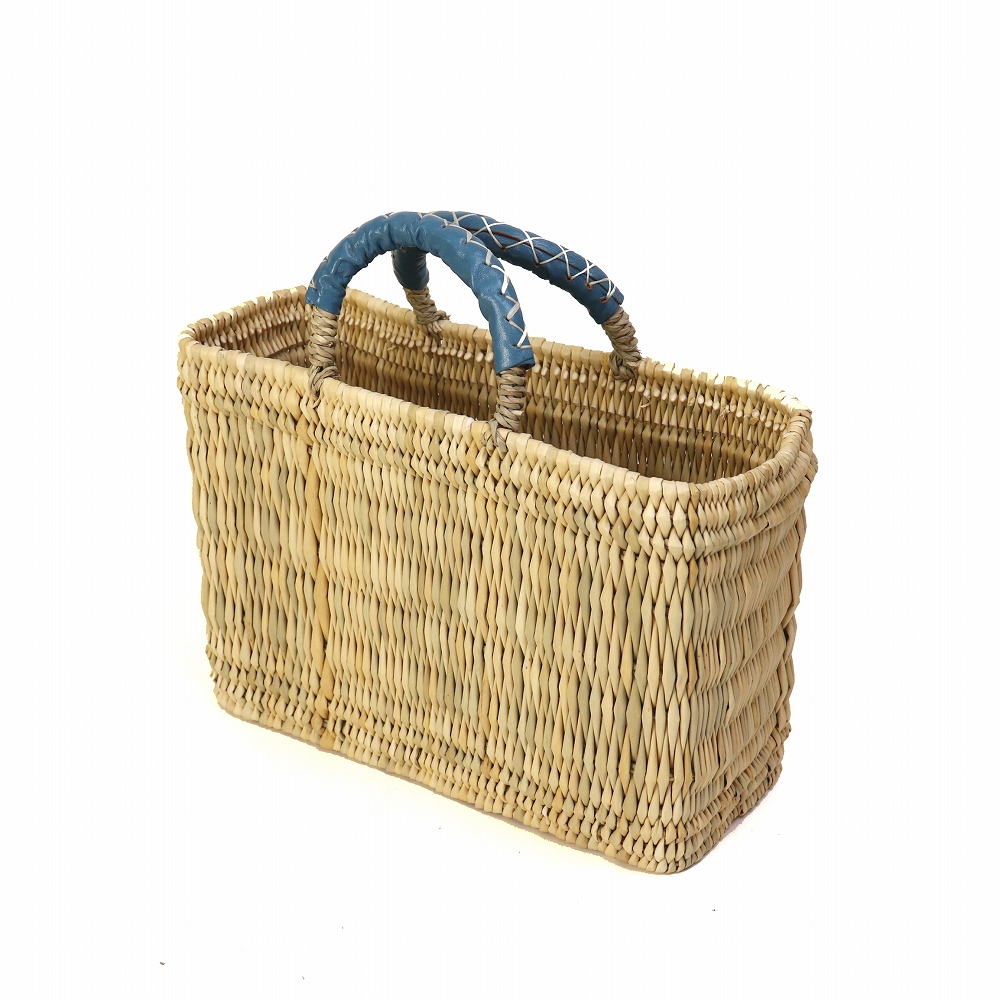 ストロー状の水草で編んだ、革クロスステッチタイプの四角かごバッグです。ハンドルの革クロスステッチがおしゃれです。モロッコでJONK(ジョンク)と呼ばれる表面がツルツルした丈夫な素材。ナチュラルな風合とたたみのような編み目が人気です。どんなお洋服にもコーディネイトしやすく、お出かけやお買い物に、ワインやお弁当をいれてランチバッグとしても活躍します。自立するので、雑誌やスリッパなどインテリアバスケットとしてもご使用いただけます。各サイズございます。
