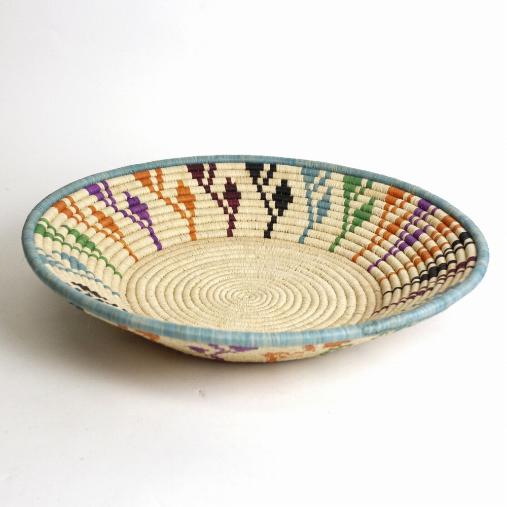 水草に椰子の葉を巻き付けて編み上げた、カラフルな柄の平カゴです。現地では穀物、果物、主に食物の運搬などに使用されています。壁に掛けてウォールデコバスケットとしてインテリアにもなります。