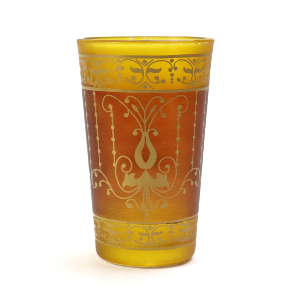 カラフルな絵柄と金色のプリントがゴージャスなモロッコグラスです。表面にエキゾチックな模様をプリントしたグラスは、現地ではミントティーグラスとして日常的に使われています。食品検査済