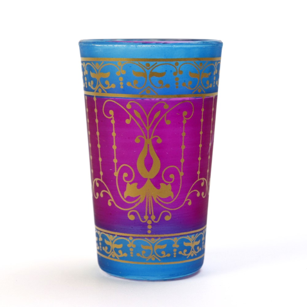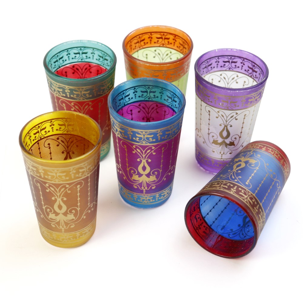 カラフルな絵柄と金色のプリントがゴージャスなモロッコグラスです。表面にエキゾチックな模様をプリントしたグラスは、現地ではミントティーグラスとして日常的に使われています。食品検査済