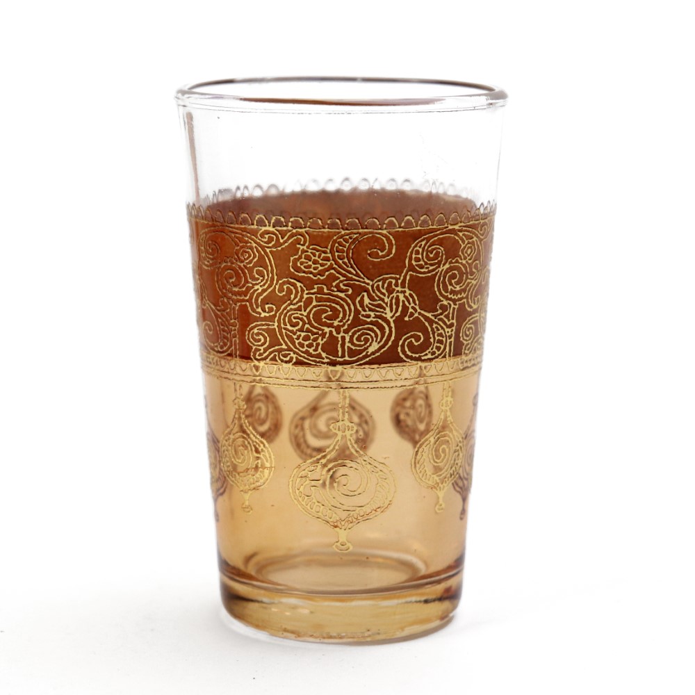 カラフルな絵柄と金色のプリントがゴージャスなモロッコグラスです。表面にエキゾチックな模様をプリントしたグラスは、現地ではミントティーグラスとして日常的に使われています。食品検査済