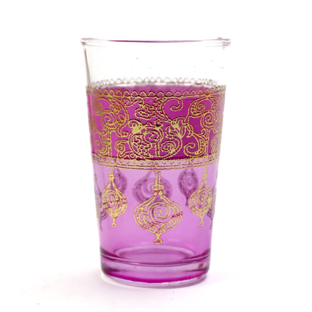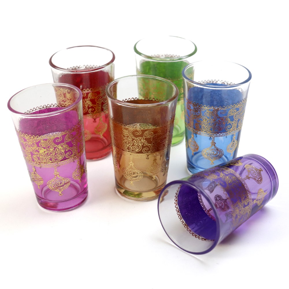 カラフルな絵柄と金色のプリントがゴージャスなモロッコグラスです。表面にエキゾチックな模様をプリントしたグラスは、現地ではミントティーグラスとして日常的に使われています。食品検査済