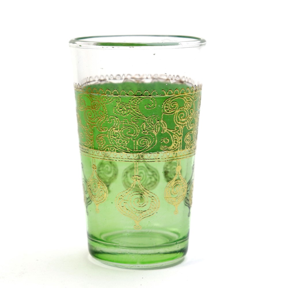 カラフルな絵柄と金色のプリントがゴージャスなモロッコグラスです。表面にエキゾチックな模様をプリントしたグラスは、現地ではミントティーグラスとして日常的に使われています。食品検査済