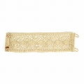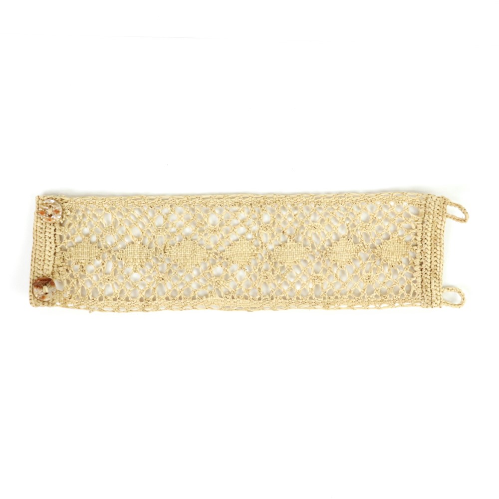 ラフィアをレース状に編んでブレスレットにしました。普段かぎ編みに使われる事が多いラフィアですが、レースを編むためには繊維が切れないぎりぎりの細さにする必要があり作れる人も限られてます。時間をかけて繊細な仕事によってとてもしなやかに出来上がったブレスレットです。