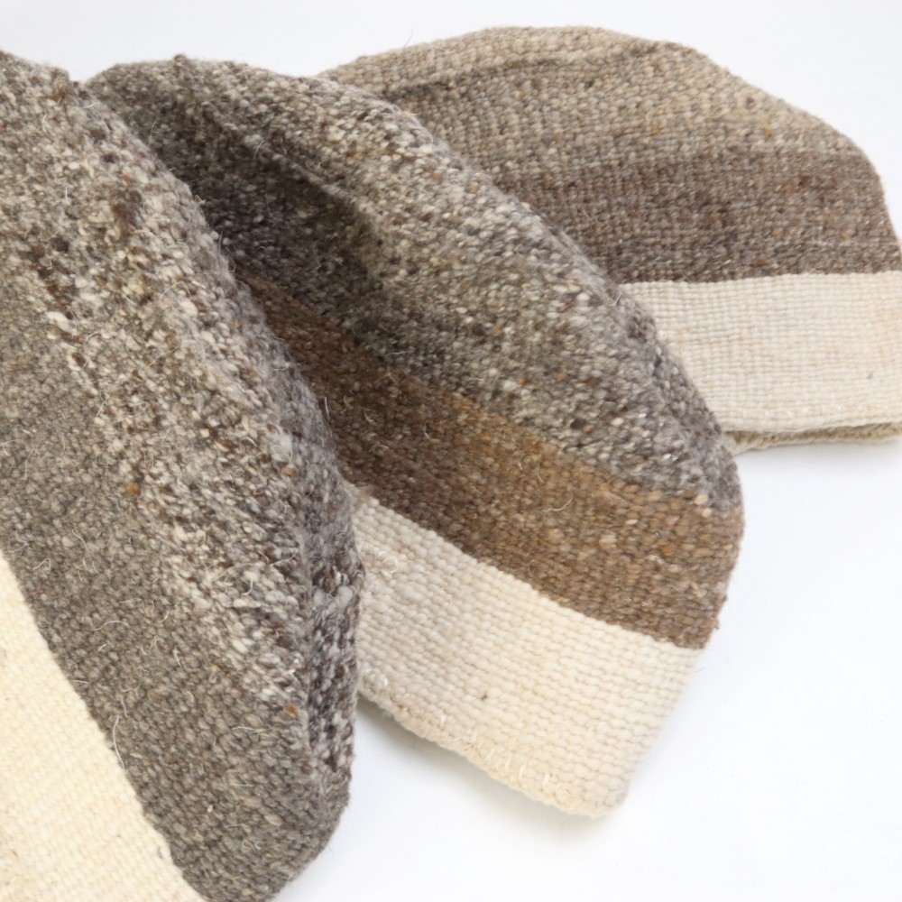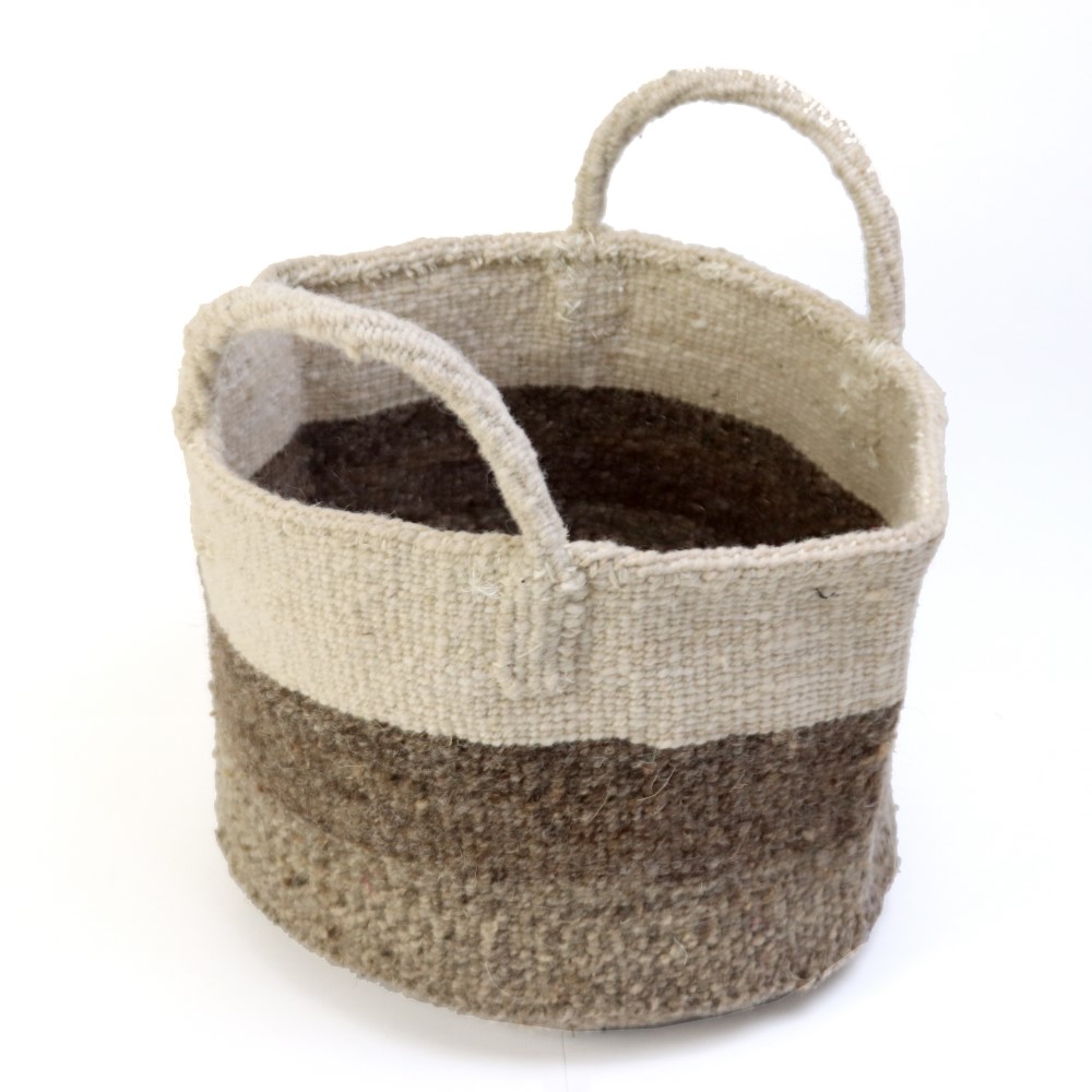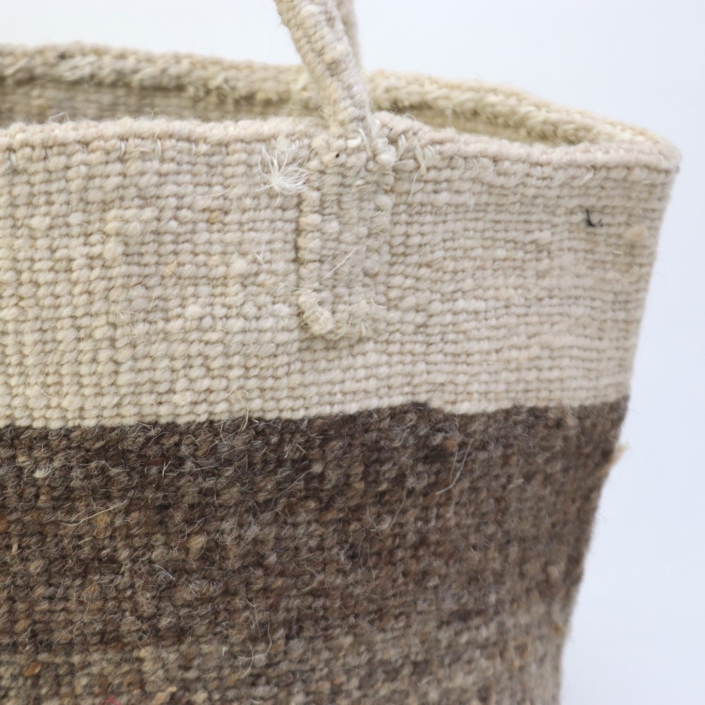 羊毛ウールの柔らかい風合いと三色の自然な色合いを生かしたボーダー柄がお洒落な羊毛サイザルバッグです。ハンドル部分にも羊毛ウールを使用しているので持ちやすく、12x8インチの横長で物もたっぷり入ります。サイザル麻を芯にして、毛糸を編みこんであるので丈夫です。使用されている羊毛は、同色の羊毛を手作業で集め、編みこんであります。染色してない自然な色合いが美しいバッグです。永くご愛用頂きたいバッグです。