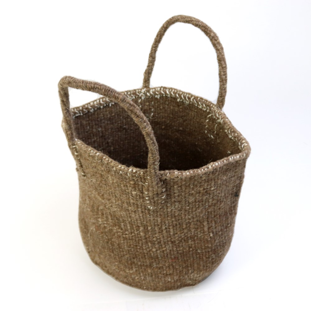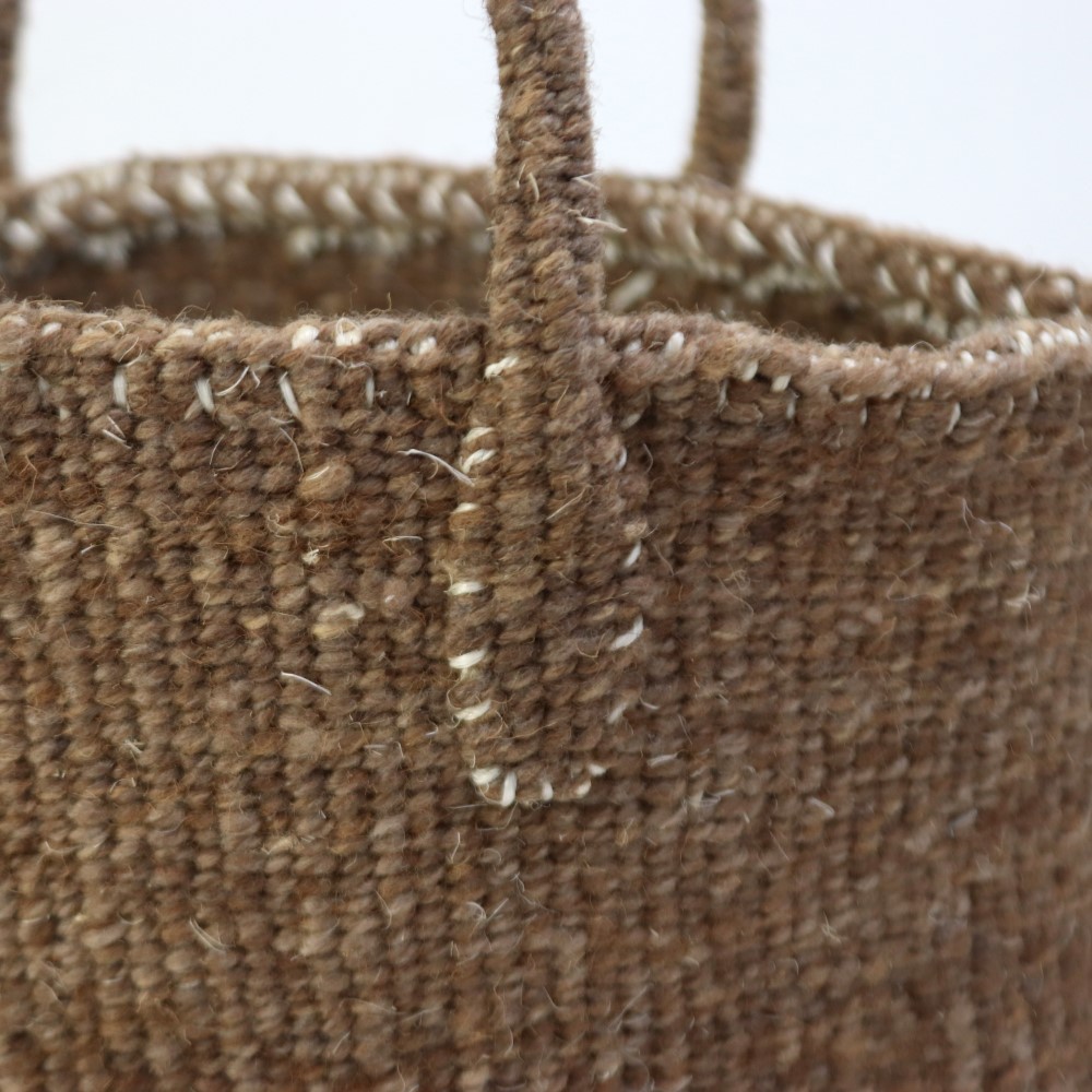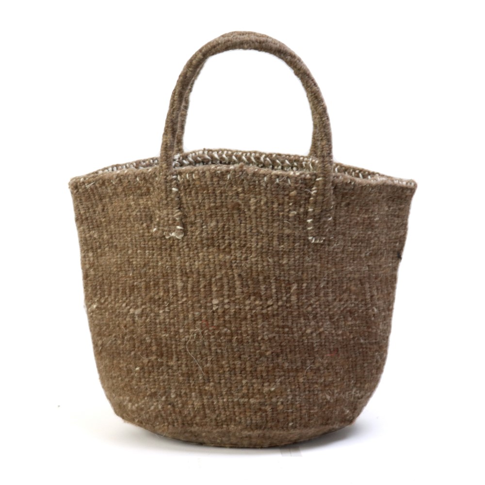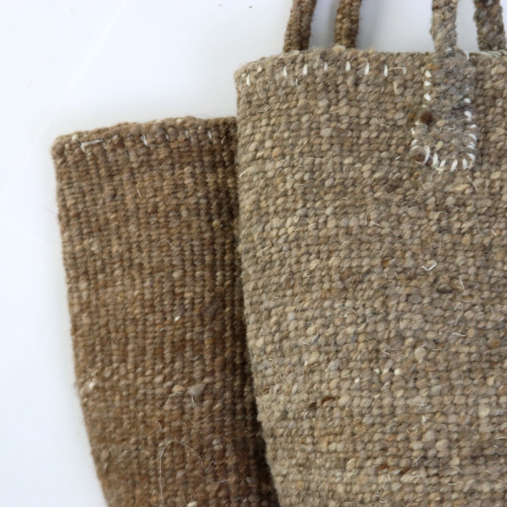羊毛ウールの柔らかい風合いと暖かな手触りが秋冬にぴったり、共手タイプの9インチウールサイザルバッグです。サイザル麻を芯にして、毛糸を編みこんであるので丈夫です。使用されている羊毛は、同色の羊毛を手作業で集め、編みこんであります。染色してない自然な色合いが美しいバッグです。永くご愛用頂きたいバッグです。