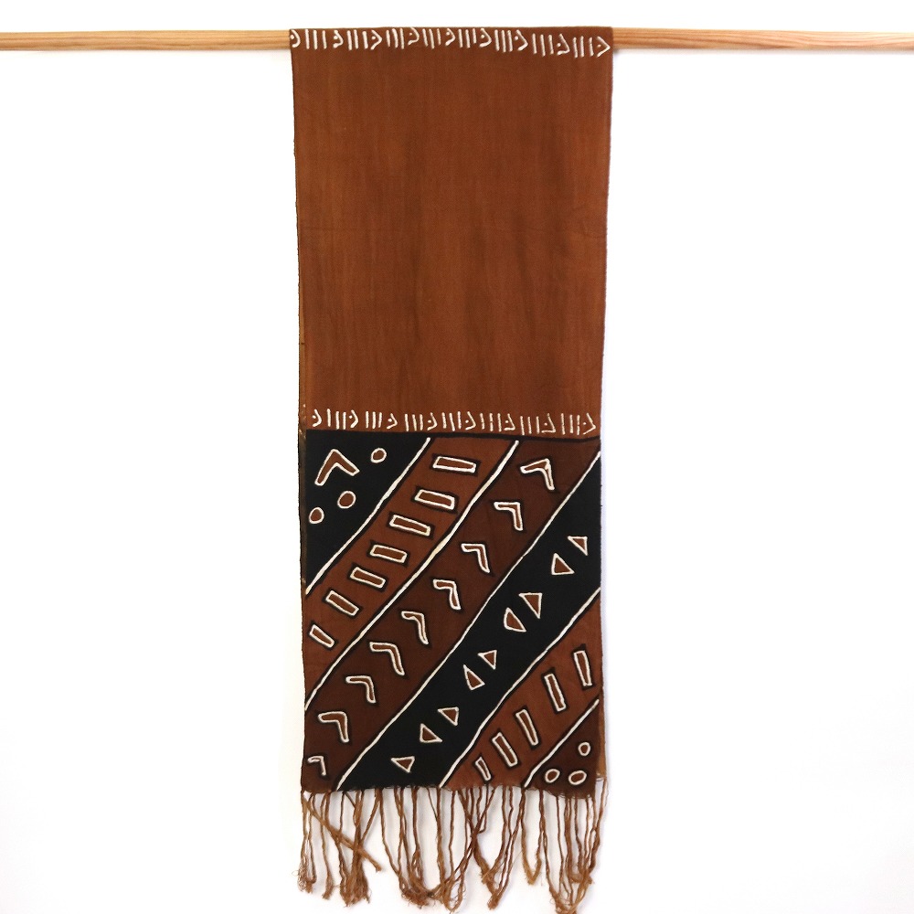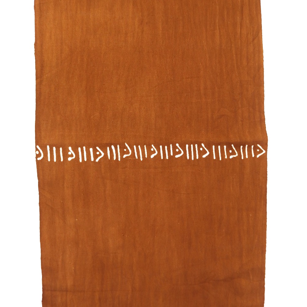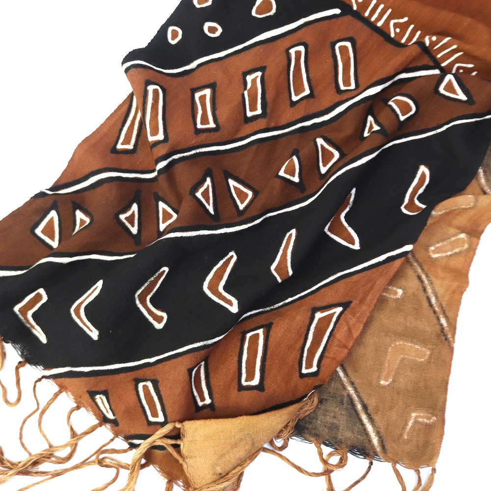 風合いの良い手織りの薄い綿布に泥染め、草木染めで模様を染めました。伝統的な行程で染められたマリの薄布ショールです。ベースカラーは、黒系は泥、茶系は草木、カーキベージュは草木+藍など、様々な天然染料を混ぜ合わせ、繊細な色を出しています。染め上がった布に、伝統柄や独創的なデザインを、ひとつひとつ手描きした、世界にひとつのショールです。ショールやスカーフ以外にも、テーブルランナーやタペストリー等お部屋のインテリアとしてお使いいただけます。天然染料のため色落ちがあり。