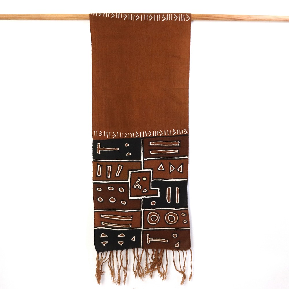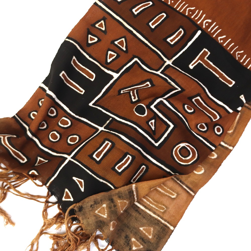 風合いの良い手織りの薄い綿布に泥染め、草木染めで模様を染めました。伝統的な行程で染められたマリの薄布ショールです。ベースカラーは、黒系は泥、茶系は草木、カーキベージュは草木+藍など、様々な天然染料を混ぜ合わせ、繊細な色を出しています。染め上がった布に、伝統柄や独創的なデザインを、ひとつひとつ手描きした、世界にひとつのショールです。ショールやスカーフ以外にも、テーブルランナーやタペストリー等お部屋のインテリアとしてお使いいただけます。天然染料のため色落ちがあり。
