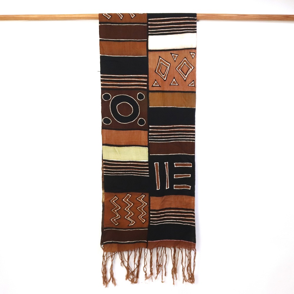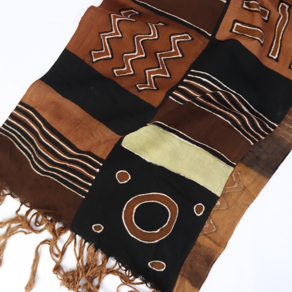 風合いの良い手織りの薄い綿布に泥染め、草木染めで模様を染めました。伝統的な行程で染められたマリの薄布ショールです。ベースカラーは、黒系は泥、茶系は草木、カーキベージュは草木+藍など、様々な天然染料を混ぜ合わせ、繊細な色を出しています。染め上がった布に、伝統柄や独創的なデザインを、ひとつひとつ手描きした、世界にひとつのショールです。ショールやスカーフ以外にも、テーブルランナーやタペストリー等お部屋のインテリアとしてお使いいただけます。天然染料のため色落ちがあり。