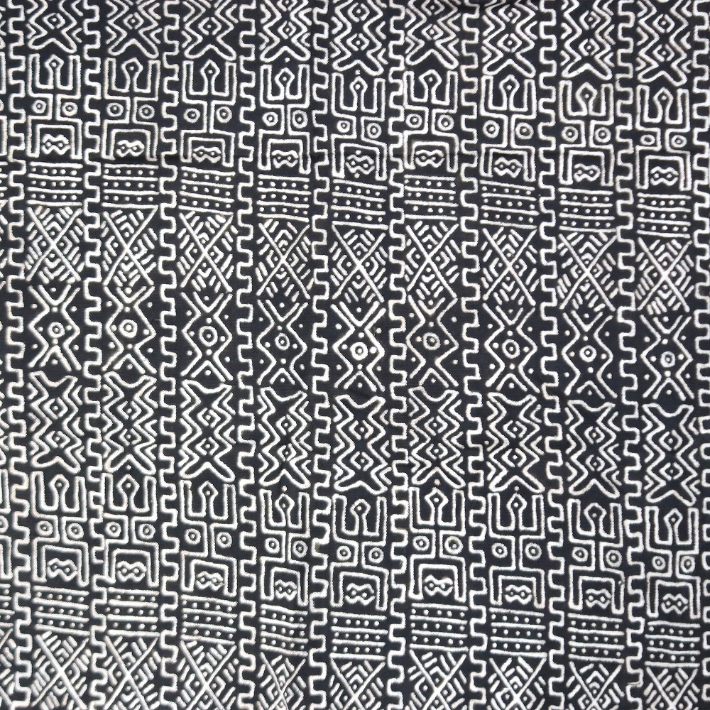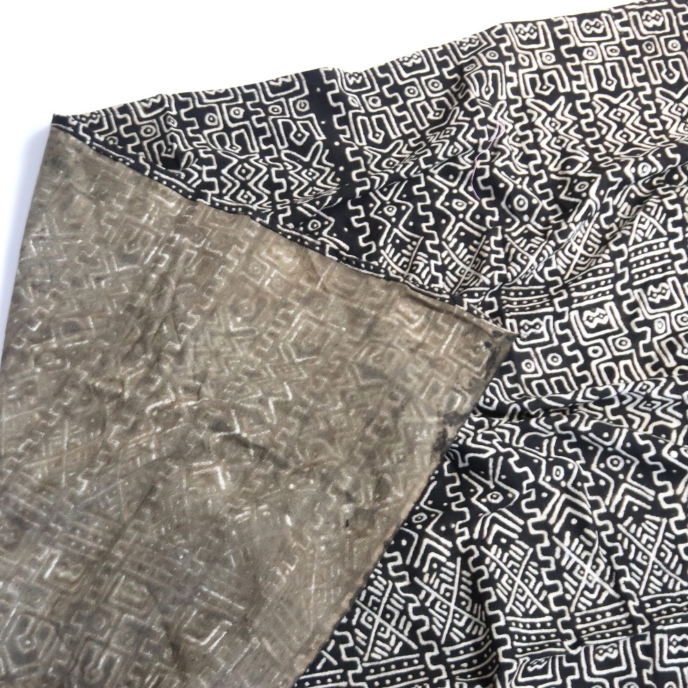 手織り布にガラマの葉で黄色く染める。→その上に泥で柄を描く→陽光にしばらくさらす。→ 水洗いすると、泥の柄がくっきり出る→何度もこの工程を繰り返す→泥染めの黒が定着