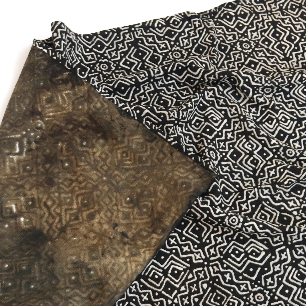 手織り布にガラマの葉で黄色く染める。→その上に泥で柄を描く→陽光にしばらくさらす。→ 水洗いすると、泥の柄がくっきり出る→何度もこの工程を繰り返す→泥染めの黒が定着