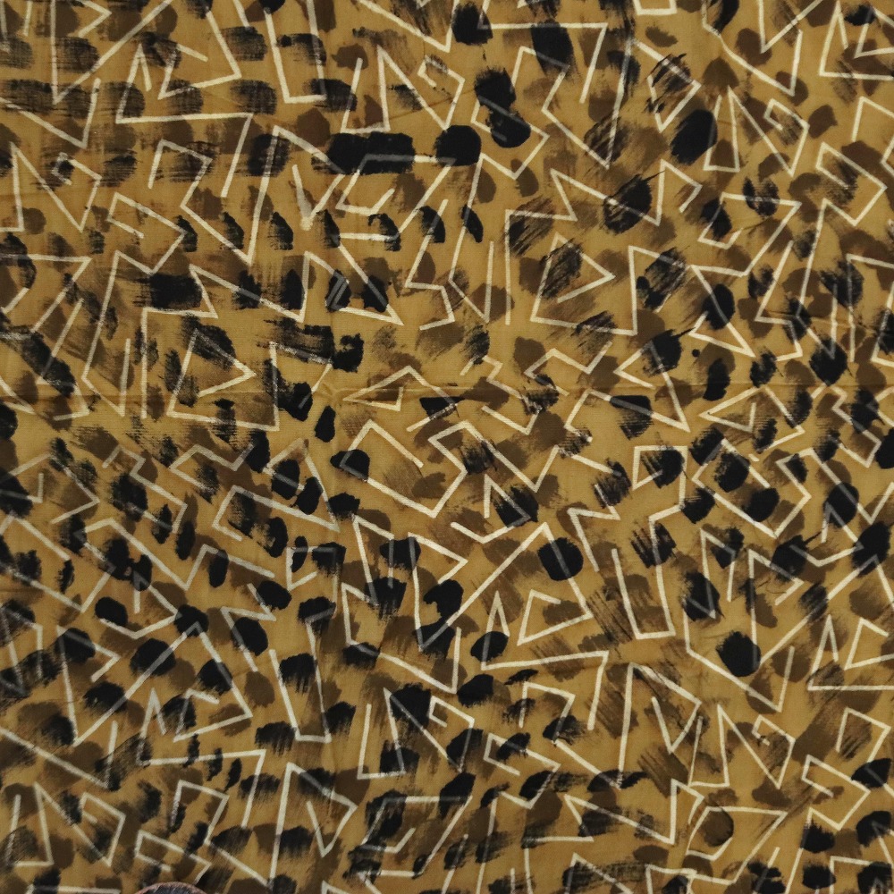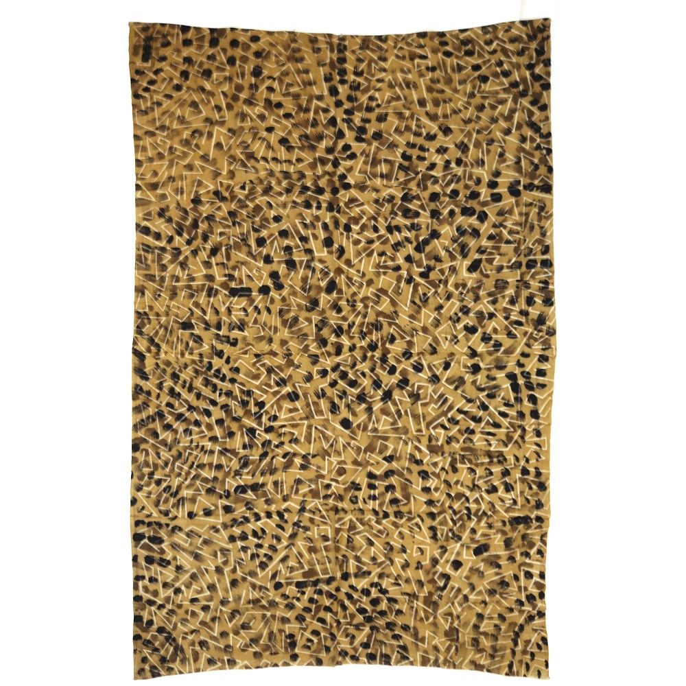 手織り布にガラマの葉で黄色く染める。→その上に泥で柄を描く→陽光にしばらくさらす。→ 水洗いすると、泥の柄がくっきり出る→何度もこの工程を繰り返す→泥染めの黒が定着