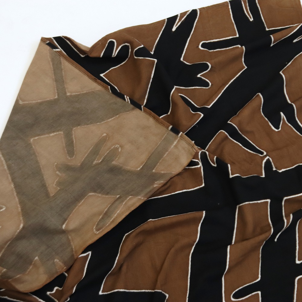 幅の細い布をつなぎ合わせて一枚布にする伝統的な生地ではなく、やや薄めの生地がベースになっています。布のゆがみやほつれ、サイズが若干異なる場合がございます。天然染料を使用しているため、多少の汚れがある場合がございます。この商品は摩擦、汗や雨などによる水濡れによって色落ち、色移りの恐れがあります。白色や淡色のものと組み合わせる際は、製品のお取り扱いに十分にご注意ください。洗濯の際にはドライクリーニングか単独での水洗いをおすすめします。以上のことを予めご了承のうえお買い求めください。